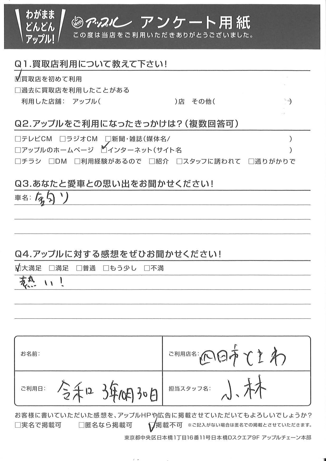 お車のご相談・ 査定だけでもOK! カンタン 入力 30秒 アップルがブランド買取始めました! お電話でも受付中! 受付時間10:00 ~ 18:30 0120-174-177 お車のご相談・ 査定だけでもOK! カンタン 入力 30秒 アップルがブランド買取始めました! お電話でも受付中! 受付時間10:00 ~ 18:30 0120-174-177 アップルがブランド買取始めました! お電話でも受付中! 受付時間10:00 ~ 18:30 0120-174-177 店舗情報 在庫車 スタッフ紹介 ブログ お客様の声 キャンペーン お得 無料査定 click お客様の声 ご記入日: 2021/10/30 O様 車名:トヨタ RAV4(R04年10月~RAV4 PHV含む) 熱い! 前へ 次へ お客様の声一覧を見る