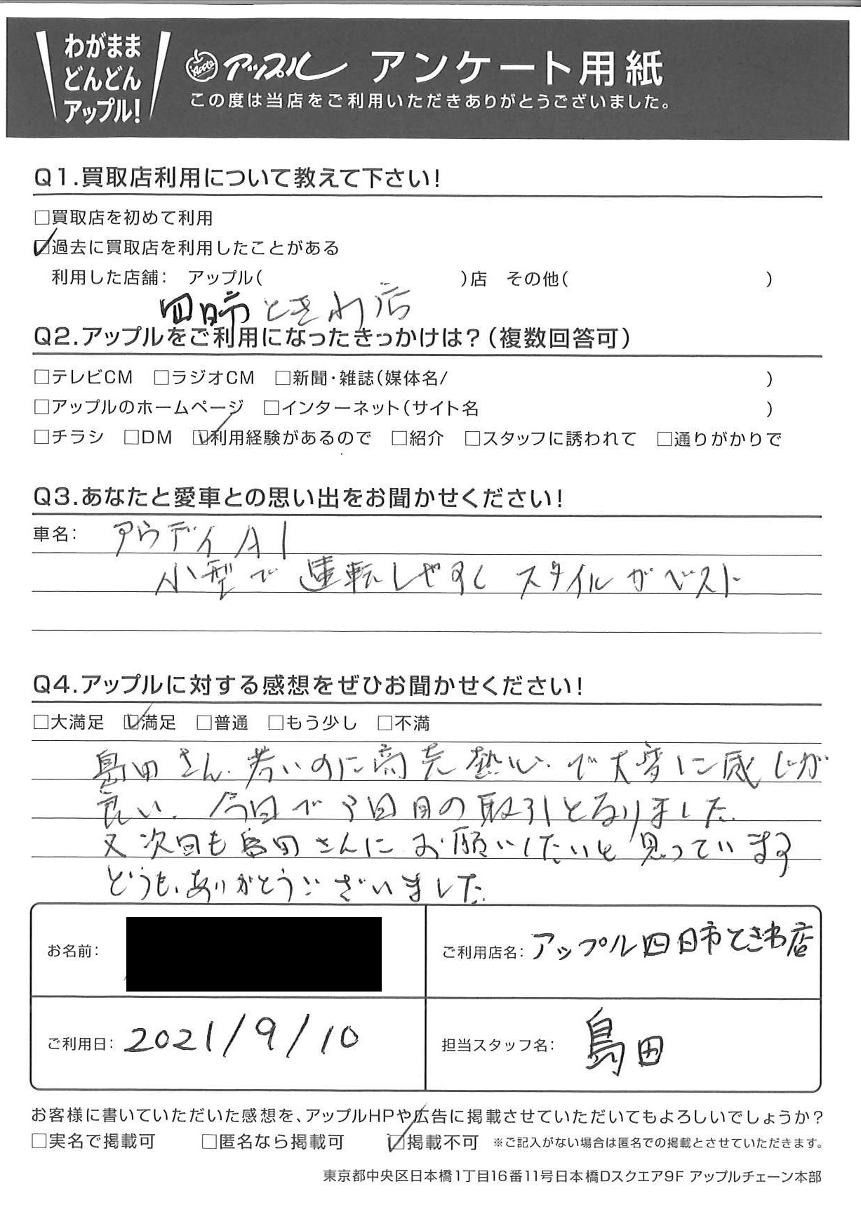 お車のご相談・ 査定だけでもOK! カンタン 入力 30秒 アップルがブランド買取始めました! お電話でも受付中! 受付時間10:00 ~ 18:30 0120-174-177 お車のご相談・ 査定だけでもOK! カンタン 入力 30秒 アップルがブランド買取始めました! お電話でも受付中! 受付時間10:00 ~ 18:30 0120-174-177 アップルがブランド買取始めました! お電話でも受付中! 受付時間10:00 ~ 18:30 0120-174-177 店舗情報 在庫車 スタッフ紹介 ブログ お客様の声 キャンペーン お得 無料査定 click お客様の声 ご記入日: 2021/09/10 S様 車名:アウディ A1 島田さん、若いのに商売熱心で大変に感じが良い。今日で3回目の取引となりました。又次回も島田さんにお願いしたいと思っていますどうもありがとうございました。 前へ 次へ お客様の声一覧を見る