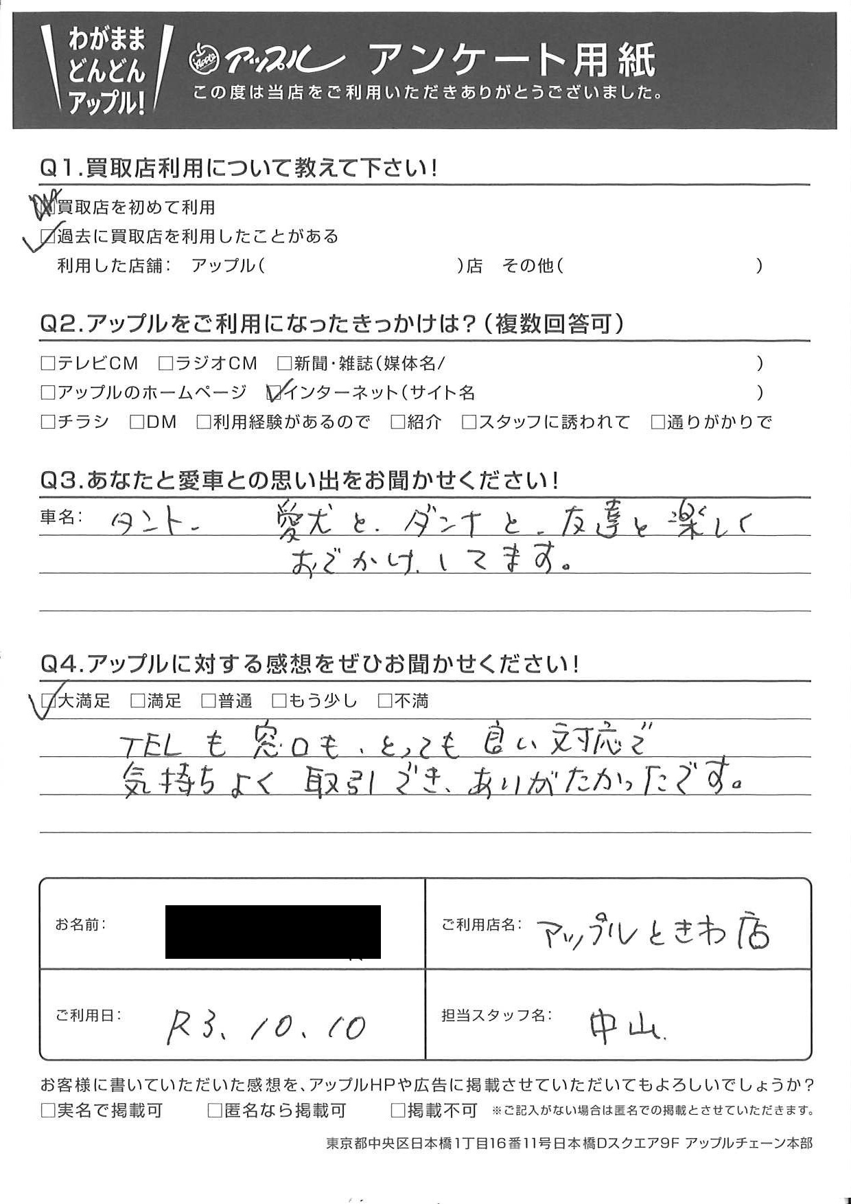 お車のご相談・ 査定だけでもOK! カンタン 入力 30秒 アップルがブランド買取始めました! お電話でも受付中! 受付時間10:00 ~ 18:30 0120-174-177 お車のご相談・ 査定だけでもOK! カンタン 入力 30秒 アップルがブランド買取始めました! お電話でも受付中! 受付時間10:00 ~ 18:30 0120-174-177 アップルがブランド買取始めました! お電話でも受付中! 受付時間10:00 ~ 18:30 0120-174-177 店舗情報 在庫車 スタッフ紹介 ブログ お客様の声 キャンペーン お得 無料査定 click お客様の声 ご記入日: 2021/10/10 T様 車名:ダイハツ タント TELも窓口も、とっても良い対応で気持ちよく取引でき、ありがたかったです。 前へ 次へ お客様の声一覧を見る