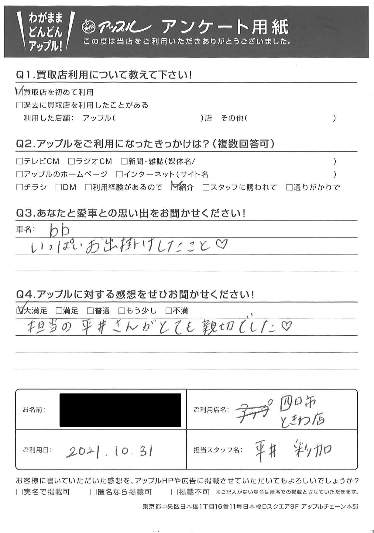 お車のご相談・ 査定だけでもOK! カンタン 入力 30秒 アップルがブランド買取始めました! お電話でも受付中! 受付時間10:00 ~ 18:30 0120-174-177 お車のご相談・ 査定だけでもOK! カンタン 入力 30秒 アップルがブランド買取始めました! お電話でも受付中! 受付時間10:00 ~ 18:30 0120-174-177 アップルがブランド買取始めました! お電話でも受付中! 受付時間10:00 ~ 18:30 0120-174-177 店舗情報 在庫車 スタッフ紹介 ブログ お客様の声 キャンペーン お得 無料査定 click お客様の声 ご記入日: 2021/10/31 I様 車名:トヨタ bB 担当の平井さんがとても親切でした♡ 前へ 次へ お客様の声一覧を見る