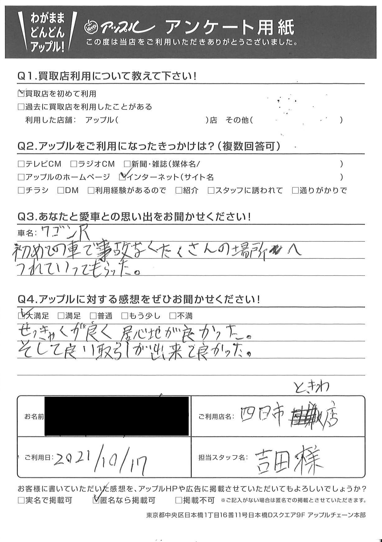 お車のご相談・ 査定だけでもOK! カンタン 入力 30秒 アップルがブランド買取始めました! お電話でも受付中! 受付時間10:00 ~ 18:30 0120-174-177 お車のご相談・ 査定だけでもOK! カンタン 入力 30秒 アップルがブランド買取始めました! お電話でも受付中! 受付時間10:00 ~ 18:30 0120-174-177 アップルがブランド買取始めました! お電話でも受付中! 受付時間10:00 ~ 18:30 0120-174-177 店舗情報 在庫車 スタッフ紹介 ブログ お客様の声 キャンペーン お得 無料査定 click お客様の声 ご記入日: 2021/10/17 W様 車名:スズキ ワゴンR せっきゃくが良く居心地が良かった。そして良い取引が出来て良かった。 前へ 次へ お客様の声一覧を見る