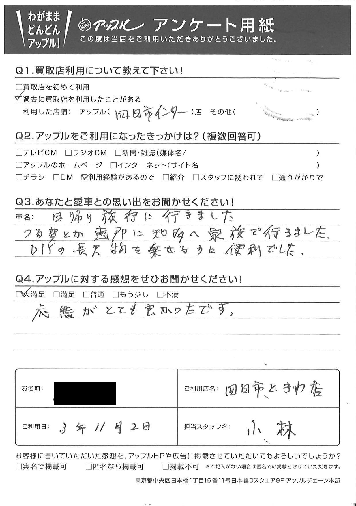 お車のご相談・ 査定だけでもOK! カンタン 入力 30秒 アップルがブランド買取始めました! お電話でも受付中! 受付時間10:00 ~ 18:30 0120-174-177 お車のご相談・ 査定だけでもOK! カンタン 入力 30秒 アップルがブランド買取始めました! お電話でも受付中! 受付時間10:00 ~ 18:30 0120-174-177 アップルがブランド買取始めました! お電話でも受付中! 受付時間10:00 ~ 18:30 0120-174-177 店舗情報 在庫車 スタッフ紹介 ブログ お客様の声 キャンペーン お得 無料査定 click お客様の声 ご記入日: 2021/11/02 S様 車名:トヨタ カローラフィールダー フィールダー(カローラ) 応態がとても良かったです。 前へ 次へ お客様の声一覧を見る