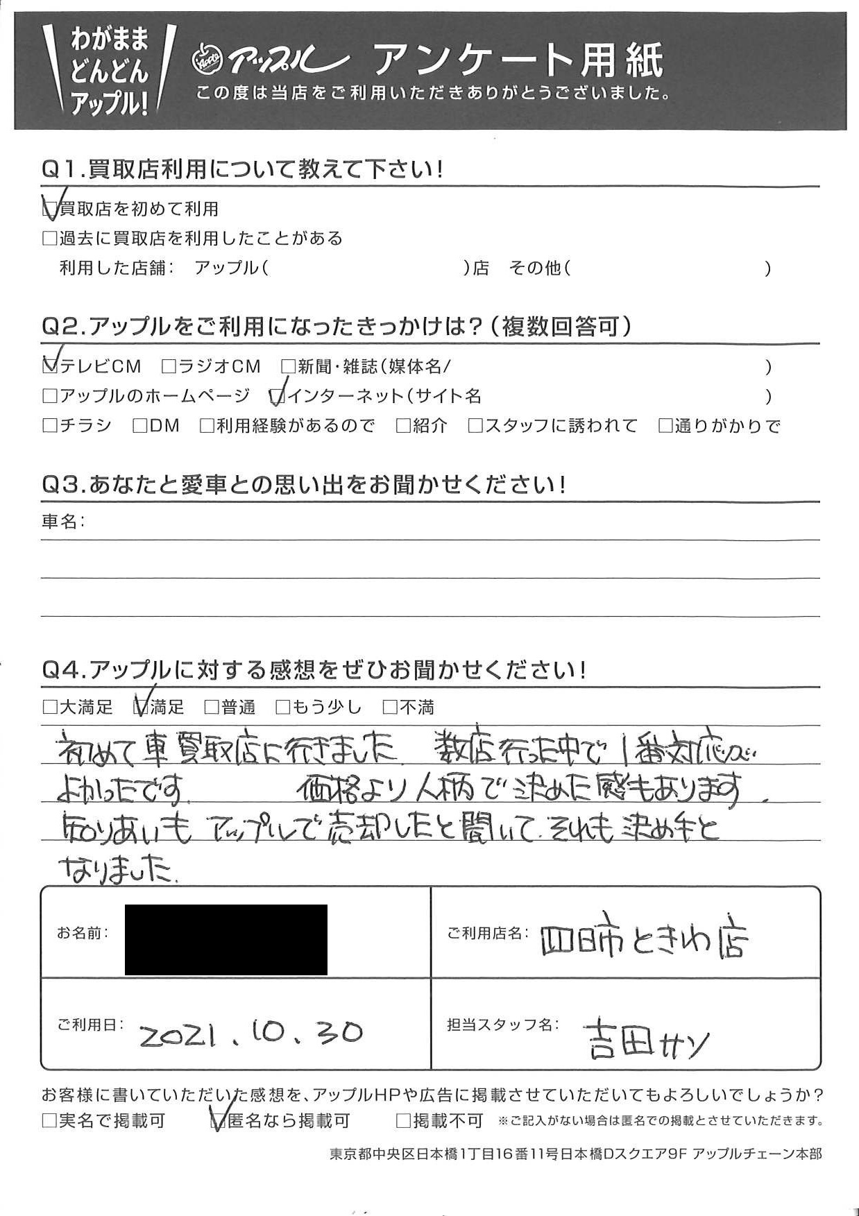 お車のご相談・ 査定だけでもOK! カンタン 入力 30秒 アップルがブランド買取始めました! お電話でも受付中! 受付時間10:00 ~ 18:30 0120-174-177 お車のご相談・ 査定だけでもOK! カンタン 入力 30秒 アップルがブランド買取始めました! お電話でも受付中! 受付時間10:00 ~ 18:30 0120-174-177 アップルがブランド買取始めました! お電話でも受付中! 受付時間10:00 ~ 18:30 0120-174-177 店舗情報 在庫車 スタッフ紹介 ブログ お客様の声 キャンペーン お得 無料査定 click お客様の声 ご記入日: 2021/10/30 T様 車名:マツダ デミオ 初めて車買取店に行きました 数店行った中で1番対応がよかったです。 価格より人柄で決めた感もあります。知りあいもアップルで売却したと聞いて、それも決め手となりました。 前へ 次へ お客様の声一覧を見る