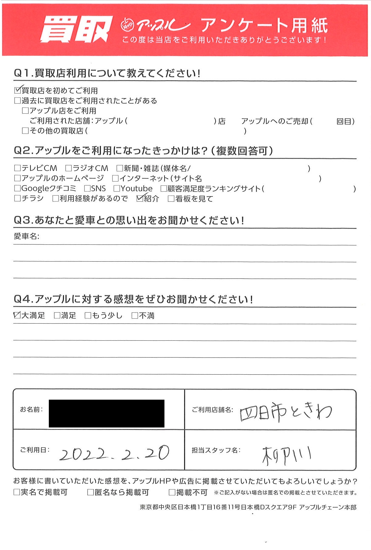 お車のご相談・ 査定だけでもOK! カンタン 入力 30秒 アップルがブランド買取始めました! お電話でも受付中! 受付時間10:00 ~ 18:30 0120-174-177 お車のご相談・ 査定だけでもOK! カンタン 入力 30秒 アップルがブランド買取始めました! お電話でも受付中! 受付時間10:00 ~ 18:30 0120-174-177 アップルがブランド買取始めました! お電話でも受付中! 受付時間10:00 ~ 18:30 0120-174-177 店舗情報 在庫車 スタッフ紹介 ブログ お客様の声 キャンペーン お得 無料査定 click お客様の声 ご記入日: 2022/02/20 M様 車名:日産 ティアナ 前へ 次へ お客様の声一覧を見る
