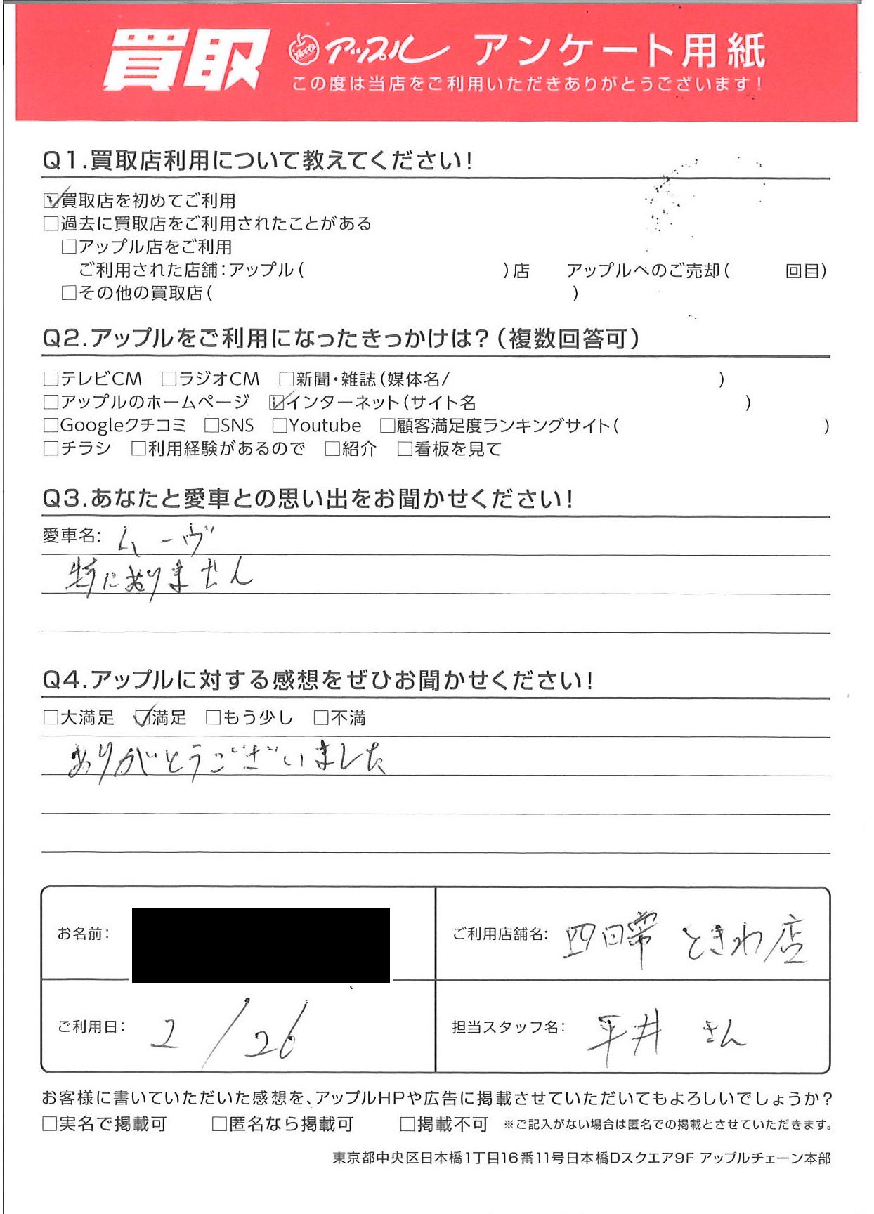 お車のご相談・ 査定だけでもOK! カンタン 入力 30秒 アップルがブランド買取始めました! お電話でも受付中! 受付時間10:00 ~ 18:30 0120-174-177 お車のご相談・ 査定だけでもOK! カンタン 入力 30秒 アップルがブランド買取始めました! お電話でも受付中! 受付時間10:00 ~ 18:30 0120-174-177 アップルがブランド買取始めました! お電話でも受付中! 受付時間10:00 ~ 18:30 0120-174-177 店舗情報 在庫車 スタッフ紹介 ブログ お客様の声 キャンペーン お得 無料査定 click お客様の声 ご記入日: 2022/02/26 K様 車名:ダイハツ ムーヴ ありがとうございました。 前へ 次へ お客様の声一覧を見る