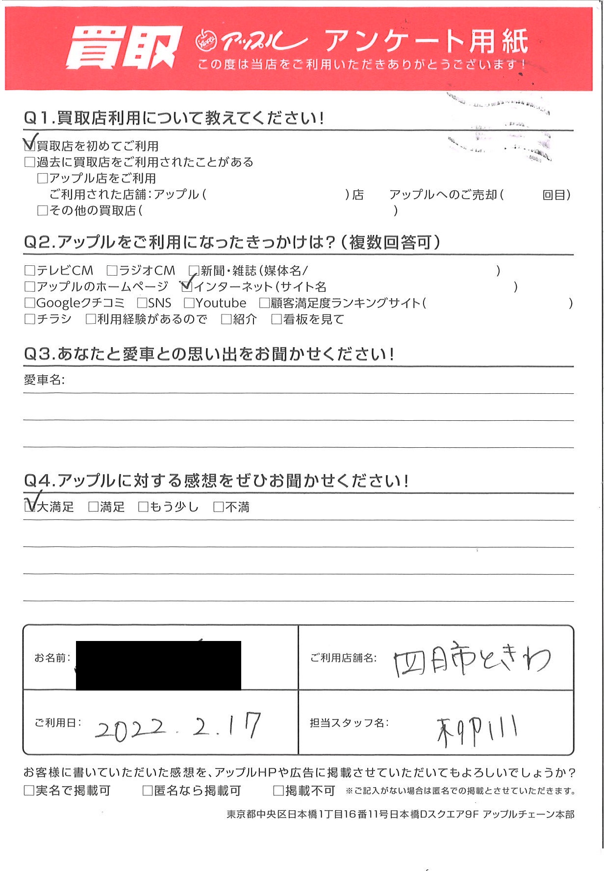 お車のご相談・ 査定だけでもOK! カンタン 入力 30秒 アップルがブランド買取始めました! お電話でも受付中! 受付時間10:00 ~ 18:30 0120-174-177 お車のご相談・ 査定だけでもOK! カンタン 入力 30秒 アップルがブランド買取始めました! お電話でも受付中! 受付時間10:00 ~ 18:30 0120-174-177 アップルがブランド買取始めました! お電話でも受付中! 受付時間10:00 ~ 18:30 0120-174-177 店舗情報 在庫車 スタッフ紹介 ブログ お客様の声 キャンペーン お得 無料査定 click お客様の声 ご記入日: 2022/02/17 S様 車名:トヨタ プロボックスバン 前へ 次へ お客様の声一覧を見る