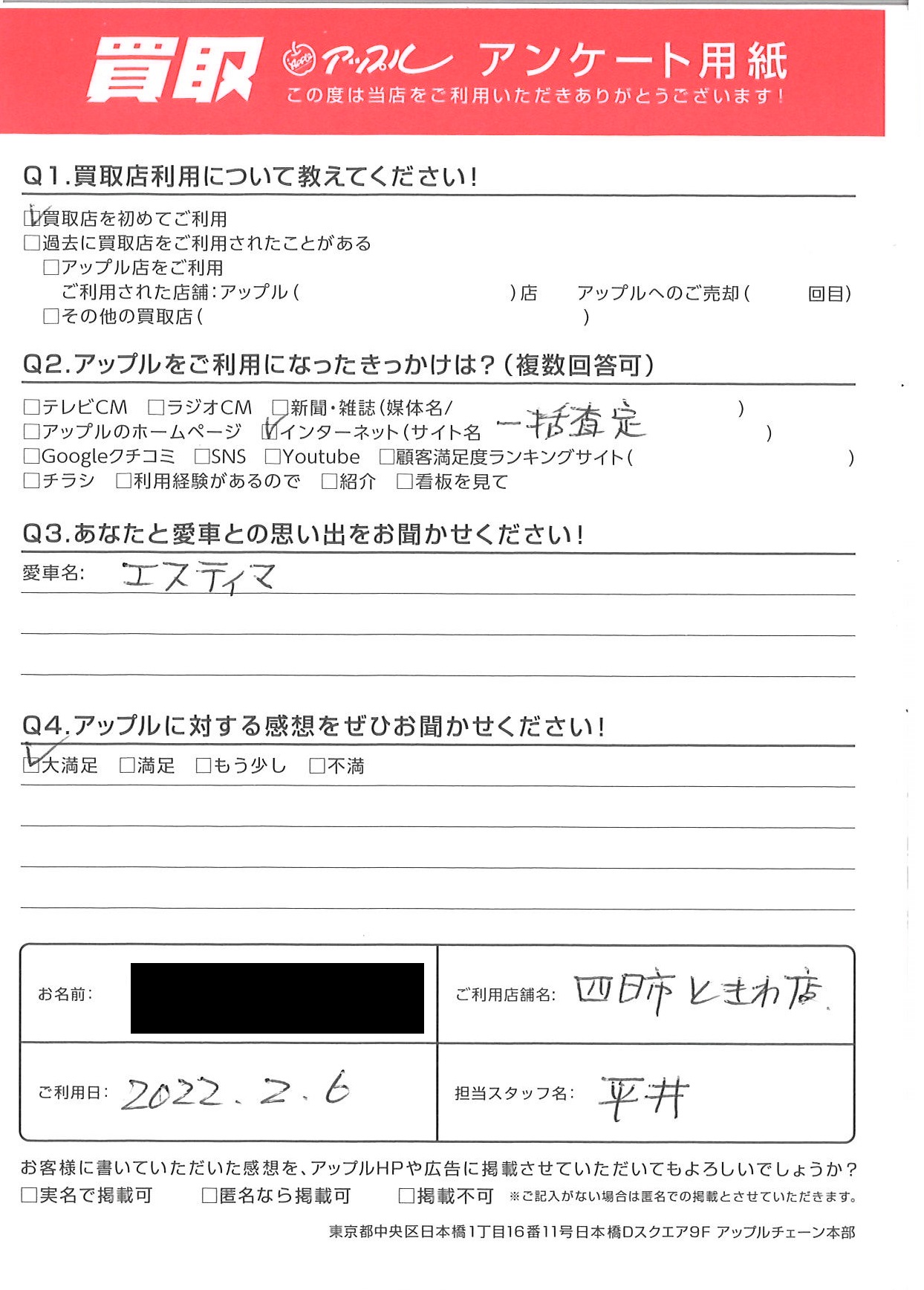お車のご相談・ 査定だけでもOK! カンタン 入力 30秒 アップルがブランド買取始めました! お電話でも受付中! 受付時間10:00 ~ 18:30 0120-174-177 お車のご相談・ 査定だけでもOK! カンタン 入力 30秒 アップルがブランド買取始めました! お電話でも受付中! 受付時間10:00 ~ 18:30 0120-174-177 アップルがブランド買取始めました! お電話でも受付中! 受付時間10:00 ~ 18:30 0120-174-177 店舗情報 在庫車 スタッフ紹介 ブログ お客様の声 キャンペーン お得 無料査定 click お客様の声 ご記入日: 2022/02/06 M様 車名:トヨタ エスティマ 前へ 次へ お客様の声一覧を見る