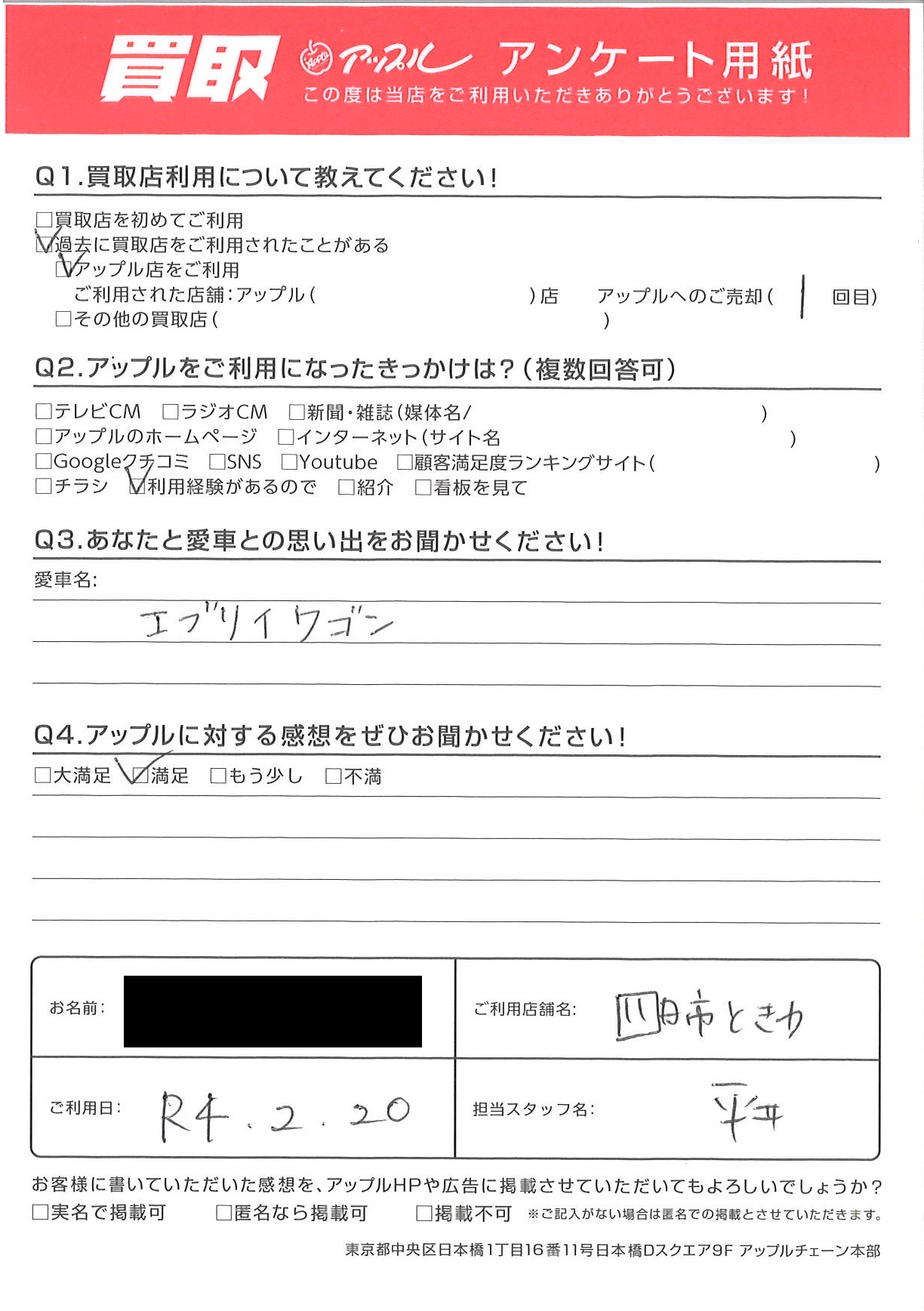 お車のご相談・ 査定だけでもOK! カンタン 入力 30秒 アップルがブランド買取始めました! お電話でも受付中! 受付時間10:00 ~ 18:30 0120-174-177 お車のご相談・ 査定だけでもOK! カンタン 入力 30秒 アップルがブランド買取始めました! お電話でも受付中! 受付時間10:00 ~ 18:30 0120-174-177 アップルがブランド買取始めました! お電話でも受付中! 受付時間10:00 ~ 18:30 0120-174-177 店舗情報 在庫車 スタッフ紹介 ブログ お客様の声 キャンペーン お得 無料査定 click お客様の声 ご記入日: -/-/- T様 車名:スズキ エブリイワゴン 前へ 次へ お客様の声一覧を見る