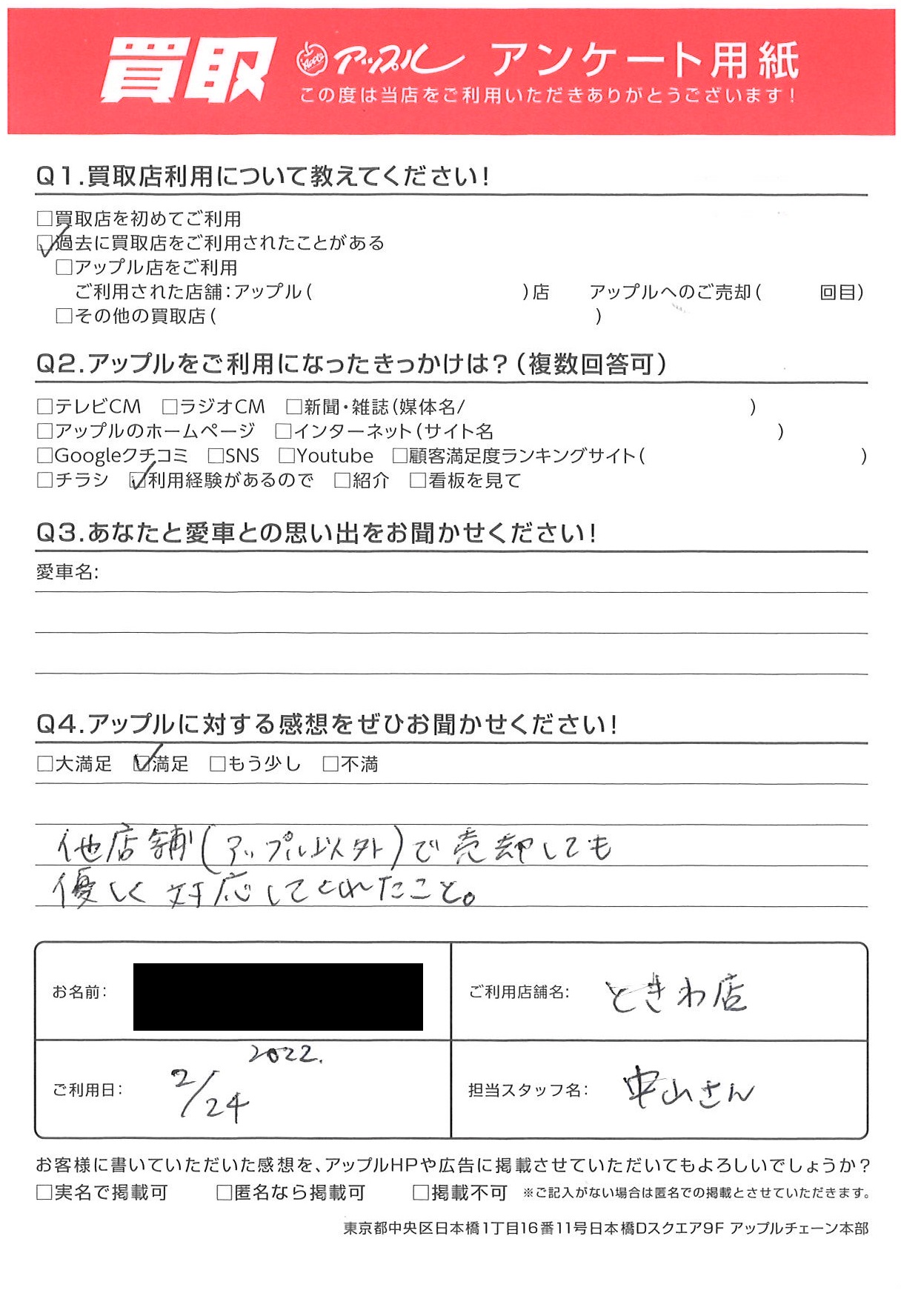 お車のご相談・ 査定だけでもOK! カンタン 入力 30秒 アップルがブランド買取始めました! お電話でも受付中! 受付時間10:00 ~ 18:30 0120-174-177 お車のご相談・ 査定だけでもOK! カンタン 入力 30秒 アップルがブランド買取始めました! お電話でも受付中! 受付時間10:00 ~ 18:30 0120-174-177 アップルがブランド買取始めました! お電話でも受付中! 受付時間10:00 ~ 18:30 0120-174-177 店舗情報 在庫車 スタッフ紹介 ブログ お客様の声 キャンペーン お得 無料査定 click お客様の声 ご記入日: 2022/02/24 N様 車名:日産 ティアナ 他店舗(アップル以外)で売却しても優しく対応してくれたこと。 前へ 次へ お客様の声一覧を見る
