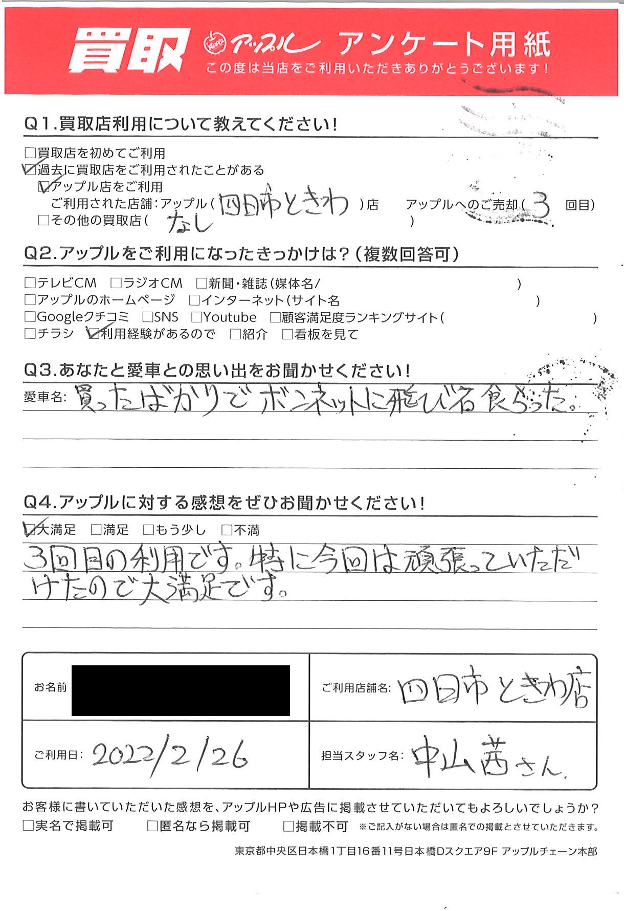お車のご相談・ 査定だけでもOK! カンタン 入力 30秒 アップルがブランド買取始めました! お電話でも受付中! 受付時間10:00 ~ 18:30 0120-174-177 お車のご相談・ 査定だけでもOK! カンタン 入力 30秒 アップルがブランド買取始めました! お電話でも受付中! 受付時間10:00 ~ 18:30 0120-174-177 アップルがブランド買取始めました! お電話でも受付中! 受付時間10:00 ~ 18:30 0120-174-177 店舗情報 在庫車 スタッフ紹介 ブログ お客様の声 キャンペーン お得 無料査定 click お客様の声 ご記入日: 2022/02/26 H 様 車名:マツダ CX-5 3回目の利用です。特に今回は頑張って頂きましたので大満足です。 前へ 次へ お客様の声一覧を見る