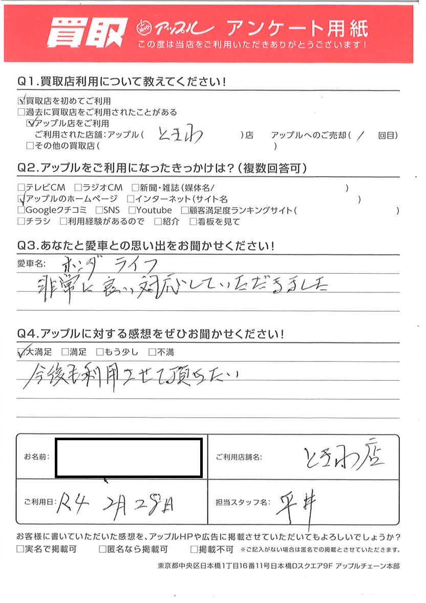 お車のご相談・ 査定だけでもOK! カンタン 入力 30秒 アップルがブランド買取始めました! お電話でも受付中! 受付時間10:00 ~ 18:30 0120-174-177 お車のご相談・ 査定だけでもOK! カンタン 入力 30秒 アップルがブランド買取始めました! お電話でも受付中! 受付時間10:00 ~ 18:30 0120-174-177 アップルがブランド買取始めました! お電話でも受付中! 受付時間10:00 ~ 18:30 0120-174-177 店舗情報 在庫車 スタッフ紹介 ブログ お客様の声 キャンペーン お得 無料査定 click お客様の声 ご記入日: 2022/02/28 S様 車名:ホンダ ライフ 非常に良い対応して頂きました。今後も利用させて頂きたい 前へ 次へ お客様の声一覧を見る