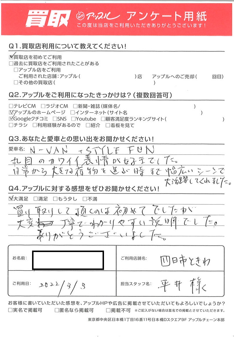 お車のご相談・ 査定だけでもOK! カンタン 入力 30秒 アップルがブランド買取始めました! お電話でも受付中! 受付時間10:00 ~ 18:30 0120-174-177 お車のご相談・ 査定だけでもOK! カンタン 入力 30秒 アップルがブランド買取始めました! お電話でも受付中! 受付時間10:00 ~ 18:30 0120-174-177 アップルがブランド買取始めました! お電話でも受付中! 受付時間10:00 ~ 18:30 0120-174-177 店舗情報 在庫車 スタッフ紹介 ブログ お客様の声 キャンペーン お得 無料査定 click お客様の声 ご記入日: 2022/03/03 H様 車名:ホンダ N-VAN 買取りして頂くのは初めてでしたが、大変丁寧でわかりやすい説明でした。ありがとうございました。 前へ 次へ お客様の声一覧を見る