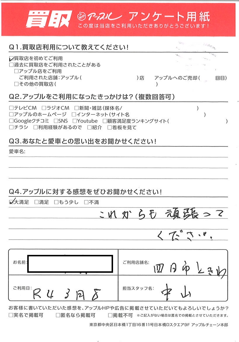 お車のご相談・ 査定だけでもOK! カンタン 入力 30秒 アップルがブランド買取始めました! お電話でも受付中! 受付時間10:00 ~ 18:30 0120-174-177 お車のご相談・ 査定だけでもOK! カンタン 入力 30秒 アップルがブランド買取始めました! お電話でも受付中! 受付時間10:00 ~ 18:30 0120-174-177 アップルがブランド買取始めました! お電話でも受付中! 受付時間10:00 ~ 18:30 0120-174-177 店舗情報 在庫車 スタッフ紹介 ブログ お客様の声 キャンペーン お得 無料査定 click お客様の声 ご記入日: 2022/03/08 T様 車名:スズキ ワゴンR これからも頑張ってください 前へ 次へ お客様の声一覧を見る
