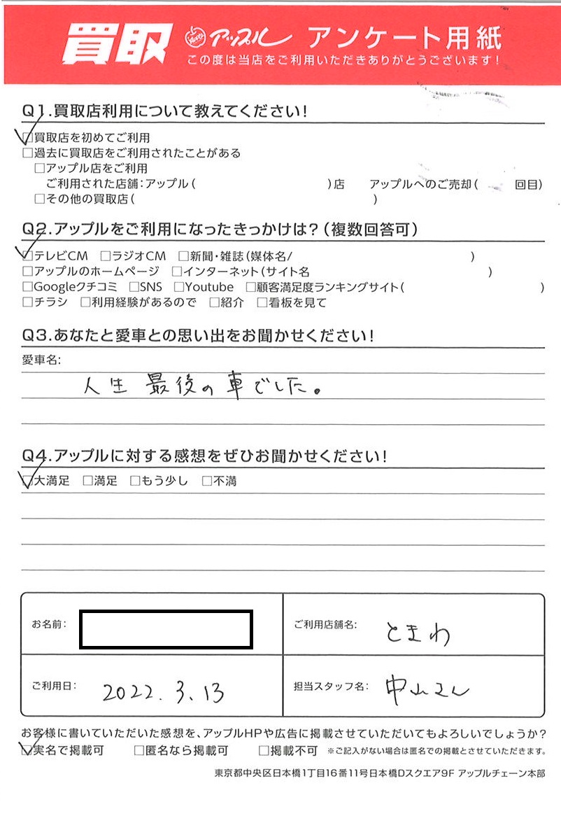 お車のご相談・ 査定だけでもOK! カンタン 入力 30秒 アップルがブランド買取始めました! お電話でも受付中! 受付時間10:00 ~ 18:30 0120-174-177 お車のご相談・ 査定だけでもOK! カンタン 入力 30秒 アップルがブランド買取始めました! お電話でも受付中! 受付時間10:00 ~ 18:30 0120-174-177 アップルがブランド買取始めました! お電話でも受付中! 受付時間10:00 ~ 18:30 0120-174-177 店舗情報 在庫車 スタッフ紹介 ブログ お客様の声 キャンペーン お得 無料査定 click お客様の声 ご記入日: 2022/03/13 H様 車名:ダイハツ ムーヴ 人生最後の車でした。 前へ 次へ お客様の声一覧を見る