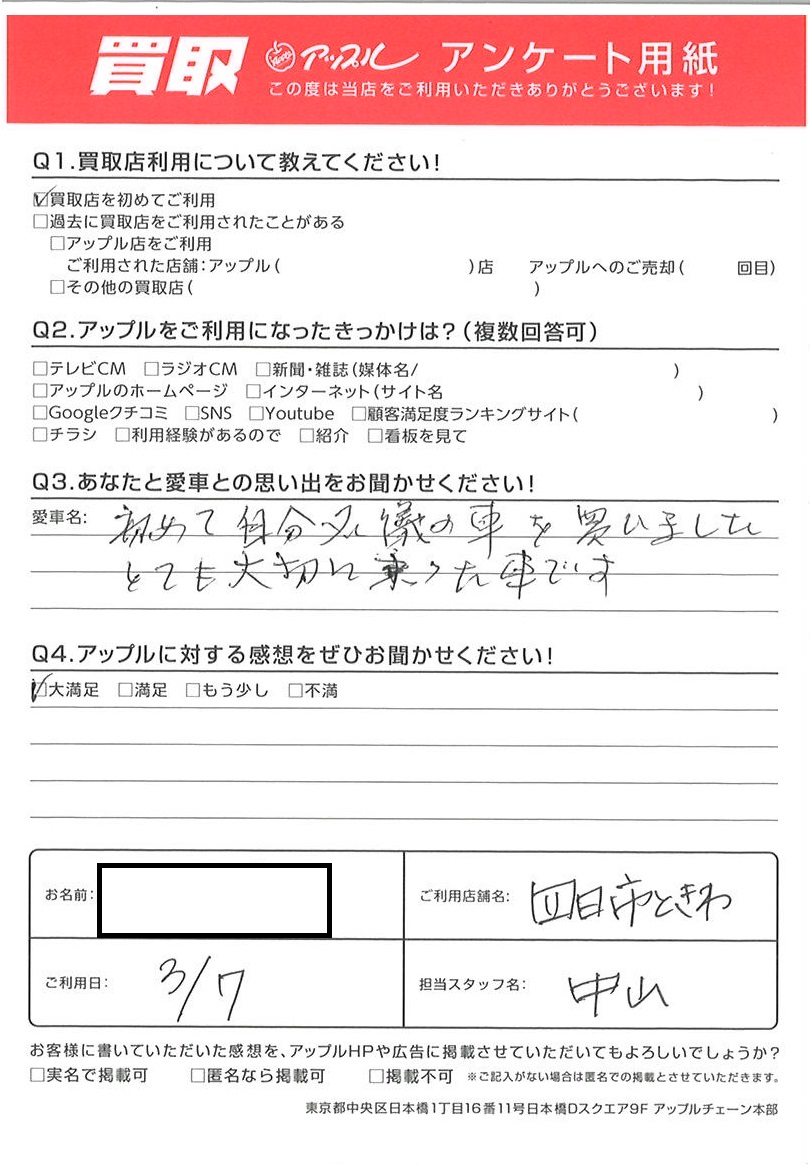 お車のご相談・ 査定だけでもOK! カンタン 入力 30秒 アップルがブランド買取始めました! お電話でも受付中! 受付時間10:00 ~ 18:30 0120-174-177 お車のご相談・ 査定だけでもOK! カンタン 入力 30秒 アップルがブランド買取始めました! お電話でも受付中! 受付時間10:00 ~ 18:30 0120-174-177 アップルがブランド買取始めました! お電話でも受付中! 受付時間10:00 ~ 18:30 0120-174-177 店舗情報 在庫車 スタッフ紹介 ブログ お客様の声 キャンペーン お得 無料査定 click お客様の声 ご記入日: 2022/03/07 I様 車名:トヨタ パッソ 初めて自分名義の車を買いました。とても大切に乗った車です。 前へ 次へ お客様の声一覧を見る