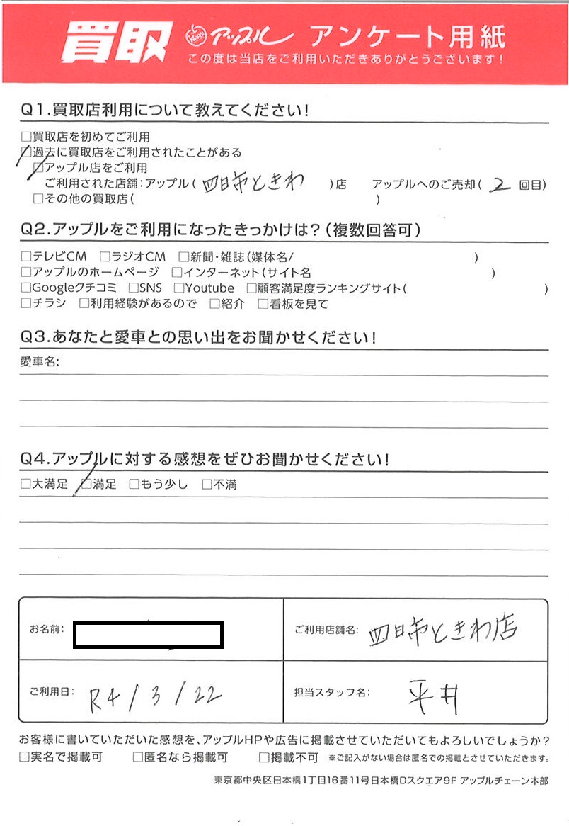 お車のご相談・ 査定だけでもOK! カンタン 入力 30秒 アップルがブランド買取始めました! お電話でも受付中! 受付時間10:00 ~ 18:30 0120-174-177 お車のご相談・ 査定だけでもOK! カンタン 入力 30秒 アップルがブランド買取始めました! お電話でも受付中! 受付時間10:00 ~ 18:30 0120-174-177 アップルがブランド買取始めました! お電話でも受付中! 受付時間10:00 ~ 18:30 0120-174-177 店舗情報 在庫車 スタッフ紹介 ブログ お客様の声 キャンペーン お得 無料査定 click お客様の声 ご記入日: 2022/03/22 I様 車名:ホンダ N-BOX 前へ 次へ お客様の声一覧を見る