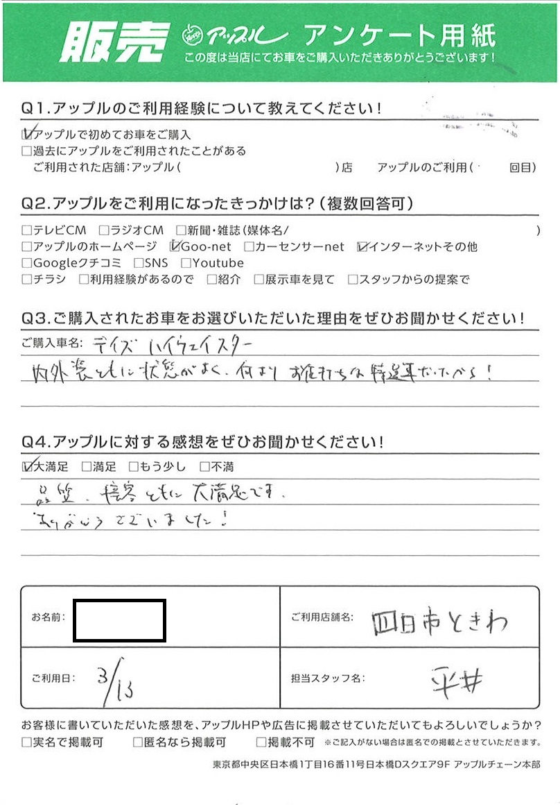 お車のご相談・ 査定だけでもOK! カンタン 入力 30秒 アップルがブランド買取始めました! お電話でも受付中! 受付時間10:00 ~ 18:30 0120-174-177 お車のご相談・ 査定だけでもOK! カンタン 入力 30秒 アップルがブランド買取始めました! お電話でも受付中! 受付時間10:00 ~ 18:30 0120-174-177 アップルがブランド買取始めました! お電話でも受付中! 受付時間10:00 ~ 18:30 0120-174-177 店舗情報 在庫車 スタッフ紹介 ブログ お客様の声 キャンペーン お得 無料査定 click お客様の声 ご記入日: 2022/03/13 N様 車名:日産 デイズ 品質・接客共に大満足です。ありがとうございました! 前へ 次へ お客様の声一覧を見る