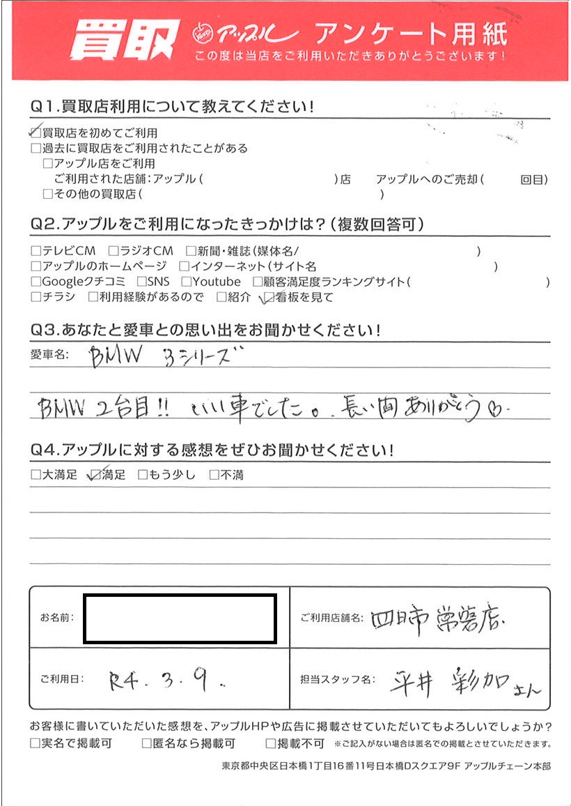 お車のご相談・ 査定だけでもOK! カンタン 入力 30秒 アップルがブランド買取始めました! お電話でも受付中! 受付時間10:00 ~ 18:30 0120-174-177 お車のご相談・ 査定だけでもOK! カンタン 入力 30秒 アップルがブランド買取始めました! お電話でも受付中! 受付時間10:00 ~ 18:30 0120-174-177 アップルがブランド買取始めました! お電話でも受付中! 受付時間10:00 ~ 18:30 0120-174-177 店舗情報 在庫車 スタッフ紹介 ブログ お客様の声 キャンペーン お得 無料査定 click お客様の声 ご記入日: 2022/03/09 U様 車名:BMW 3シリーズセダン BMW2台目!! いい車でした。長い間ありがとう♡ 前へ 次へ お客様の声一覧を見る