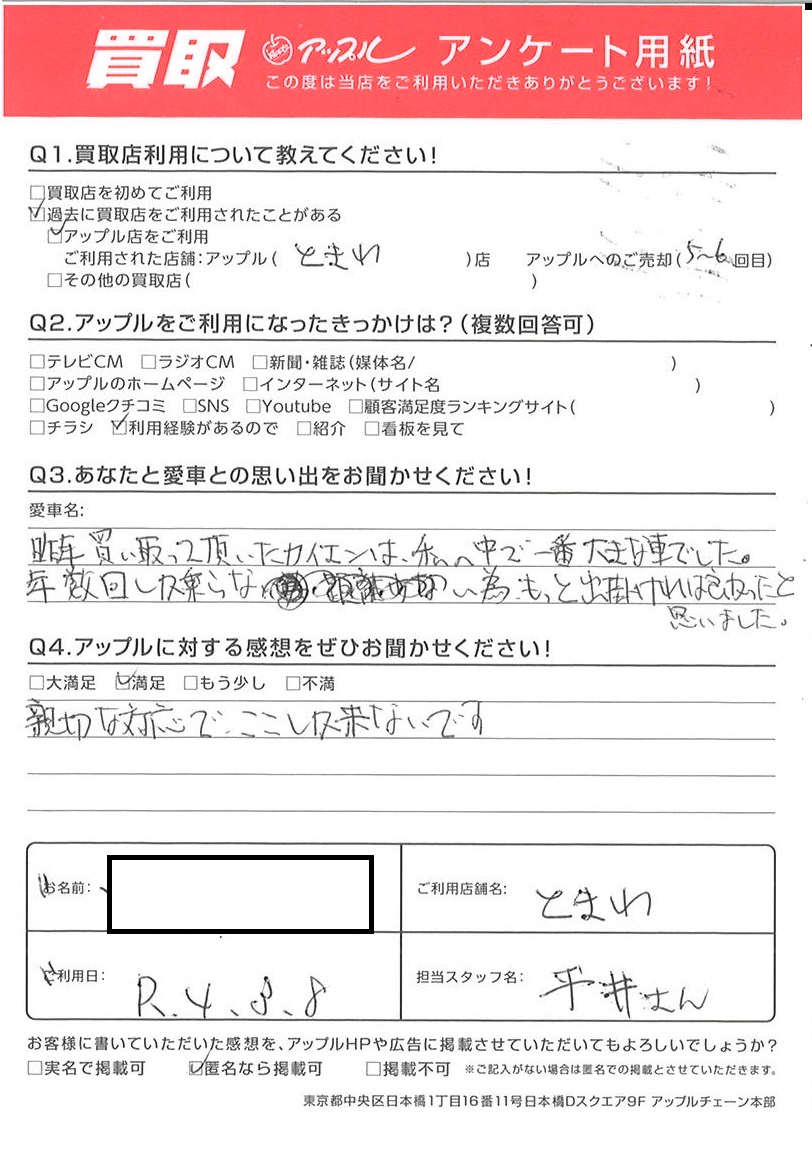 お車のご相談・ 査定だけでもOK! カンタン 入力 30秒 アップルがブランド買取始めました! お電話でも受付中! 受付時間10:00 ~ 18:30 0120-174-177 お車のご相談・ 査定だけでもOK! カンタン 入力 30秒 アップルがブランド買取始めました! お電話でも受付中! 受付時間10:00 ~ 18:30 0120-174-177 アップルがブランド買取始めました! お電話でも受付中! 受付時間10:00 ~ 18:30 0120-174-177 店舗情報 在庫車 スタッフ紹介 ブログ お客様の声 キャンペーン お得 無料査定 click お客様の声 ご記入日: 2022/03/08 M様 車名:ホンダ ライフ 親切な対応で、ここにしか来ないです 前へ 次へ お客様の声一覧を見る