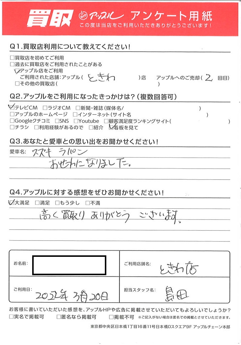 お車のご相談・ 査定だけでもOK! カンタン 入力 30秒 アップルがブランド買取始めました! お電話でも受付中! 受付時間10:00 ~ 18:30 0120-174-177 お車のご相談・ 査定だけでもOK! カンタン 入力 30秒 アップルがブランド買取始めました! お電話でも受付中! 受付時間10:00 ~ 18:30 0120-174-177 アップルがブランド買取始めました! お電話でも受付中! 受付時間10:00 ~ 18:30 0120-174-177 店舗情報 在庫車 スタッフ紹介 ブログ お客様の声 キャンペーン お得 無料査定 click お客様の声 ご記入日: 2022/03/20 U様 車名:スズキ アルトラパン ラパン(アルト) 高く買取りありがとうございます。 前へ 次へ お客様の声一覧を見る
