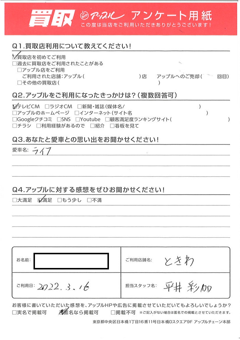 お車のご相談・ 査定だけでもOK! カンタン 入力 30秒 アップルがブランド買取始めました! お電話でも受付中! 受付時間10:00 ~ 18:30 0120-174-177 お車のご相談・ 査定だけでもOK! カンタン 入力 30秒 アップルがブランド買取始めました! お電話でも受付中! 受付時間10:00 ~ 18:30 0120-174-177 アップルがブランド買取始めました! お電話でも受付中! 受付時間10:00 ~ 18:30 0120-174-177 店舗情報 在庫車 スタッフ紹介 ブログ お客様の声 キャンペーン お得 無料査定 click お客様の声 ご記入日: 2022/03/16 H様 車名:ホンダ ライフ 前へ 次へ お客様の声一覧を見る