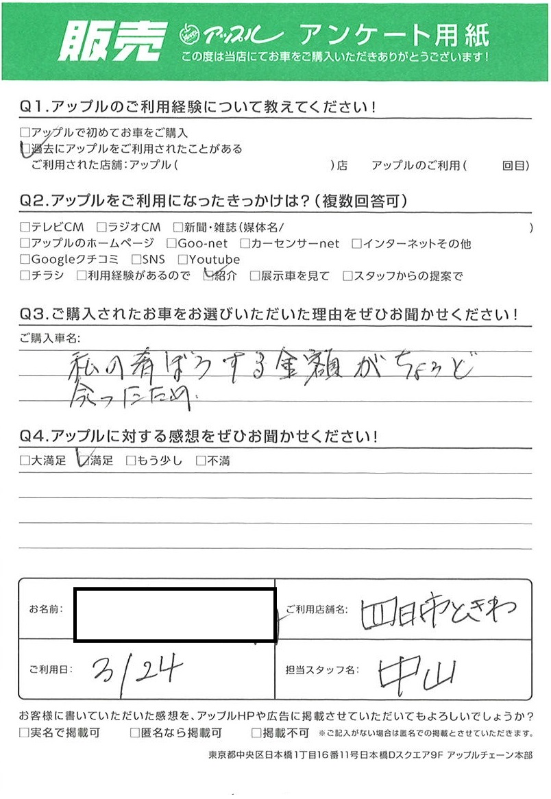 お車のご相談・ 査定だけでもOK! カンタン 入力 30秒 アップルがブランド買取始めました! お電話でも受付中! 受付時間10:00 ~ 18:30 0120-174-177 お車のご相談・ 査定だけでもOK! カンタン 入力 30秒 アップルがブランド買取始めました! お電話でも受付中! 受付時間10:00 ~ 18:30 0120-174-177 アップルがブランド買取始めました! お電話でも受付中! 受付時間10:00 ~ 18:30 0120-174-177 店舗情報 在庫車 スタッフ紹介 ブログ お客様の声 キャンペーン お得 無料査定 click お客様の声 ご記入日: 2022/03/24 S様 車名:ダイハツ タント 私の希望する金額がちょうどあったため 前へ 次へ お客様の声一覧を見る