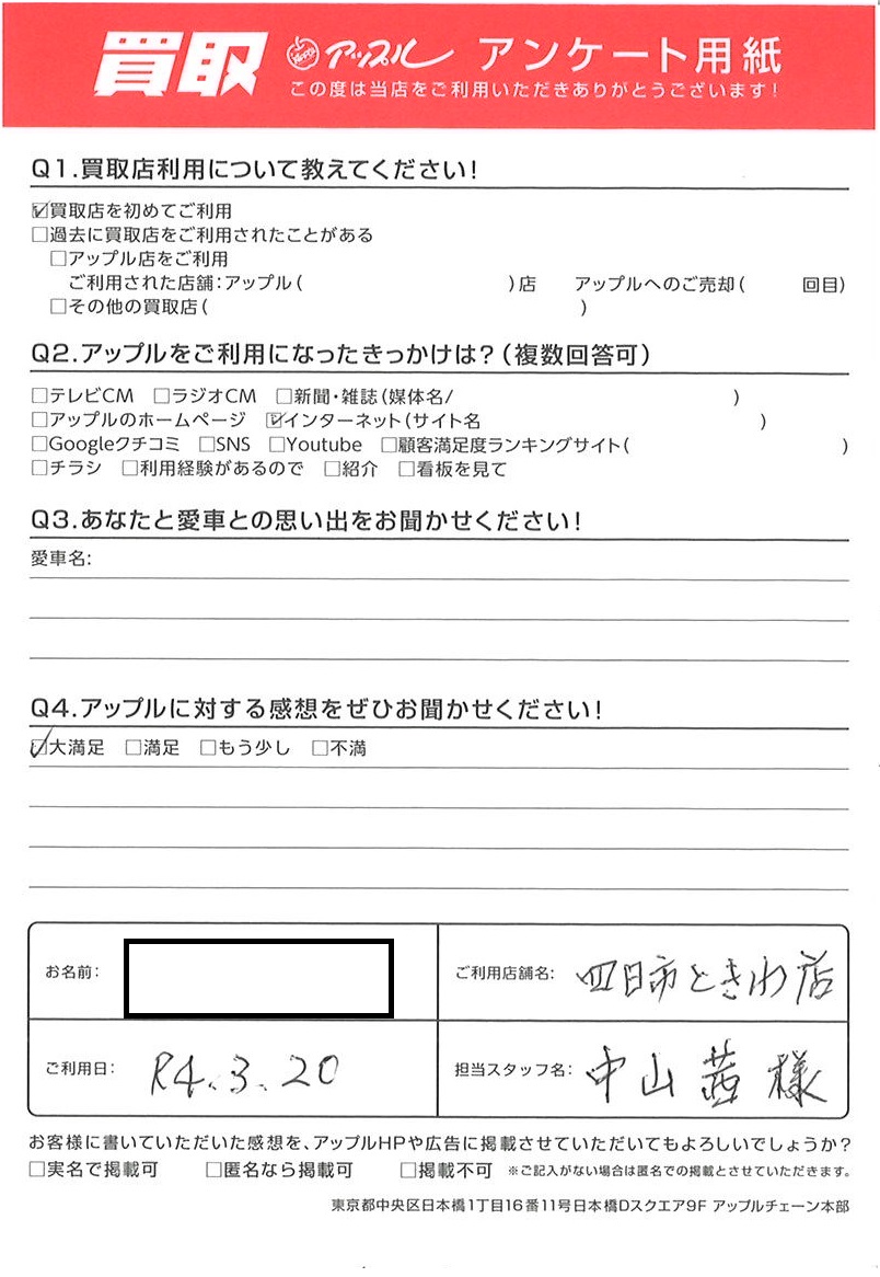 お車のご相談・ 査定だけでもOK! カンタン 入力 30秒 アップルがブランド買取始めました! お電話でも受付中! 受付時間10:00 ~ 18:30 0120-174-177 お車のご相談・ 査定だけでもOK! カンタン 入力 30秒 アップルがブランド買取始めました! お電話でも受付中! 受付時間10:00 ~ 18:30 0120-174-177 アップルがブランド買取始めました! お電話でも受付中! 受付時間10:00 ~ 18:30 0120-174-177 店舗情報 在庫車 スタッフ紹介 ブログ お客様の声 キャンペーン お得 無料査定 click お客様の声 ご記入日: 2022/03/20 K様 車名:ダイハツ ムーヴ 前へ 次へ お客様の声一覧を見る
