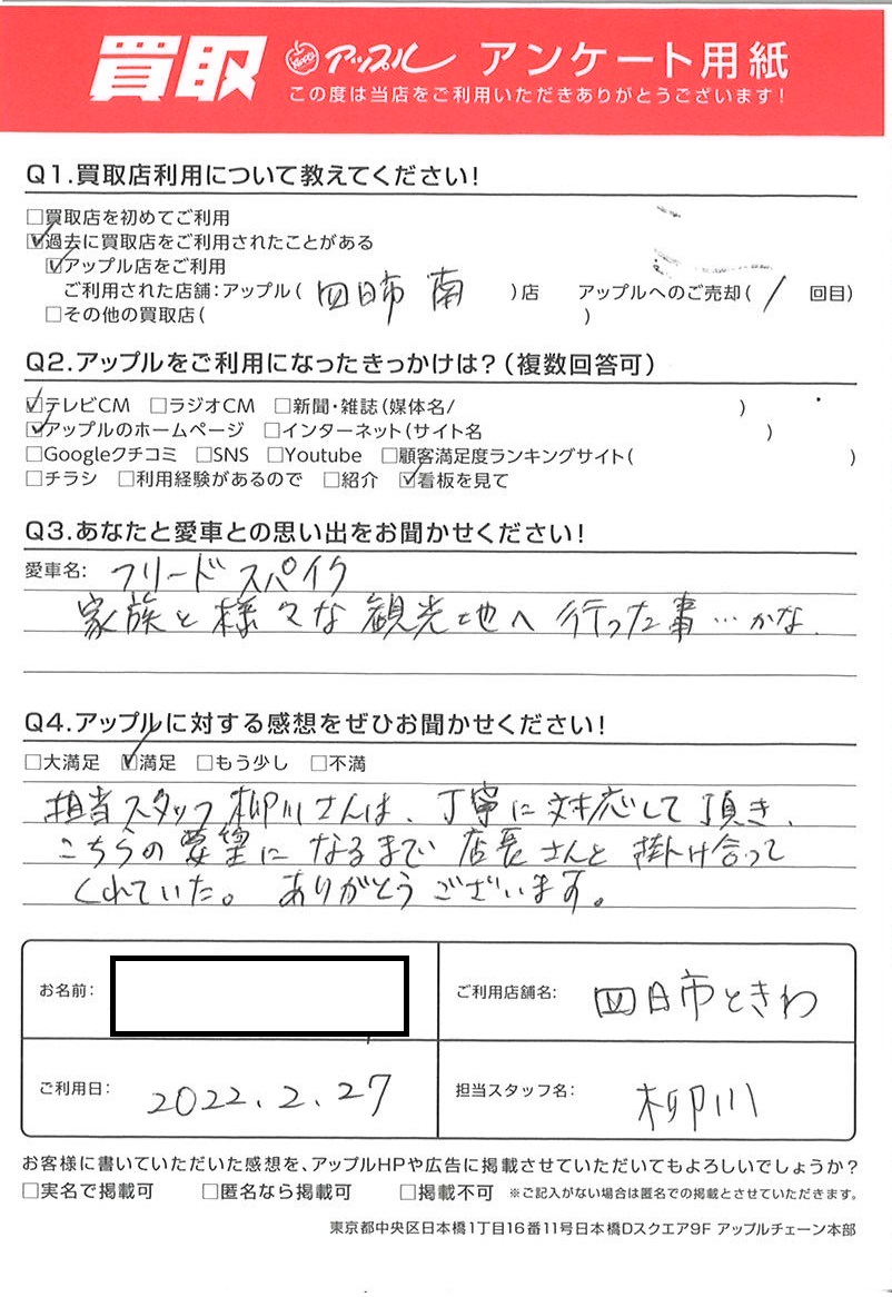 お車のご相談・ 査定だけでもOK! カンタン 入力 30秒 アップルがブランド買取始めました! お電話でも受付中! 受付時間10:00 ~ 18:30 0120-174-177 お車のご相談・ 査定だけでもOK! カンタン 入力 30秒 アップルがブランド買取始めました! お電話でも受付中! 受付時間10:00 ~ 18:30 0120-174-177 アップルがブランド買取始めました! お電話でも受付中! 受付時間10:00 ~ 18:30 0120-174-177 店舗情報 在庫車 スタッフ紹介 ブログ お客様の声 キャンペーン お得 無料査定 click お客様の声 ご記入日: 2022/02/27 I様 車名:ホンダ フリードスパイク 担当スタッフの柳川さんは、丁寧に対応して頂き、こちらの要望になるまで店長さんろ掛け合ってくれていた。ありがとうございます。 前へ 次へ お客様の声一覧を見る