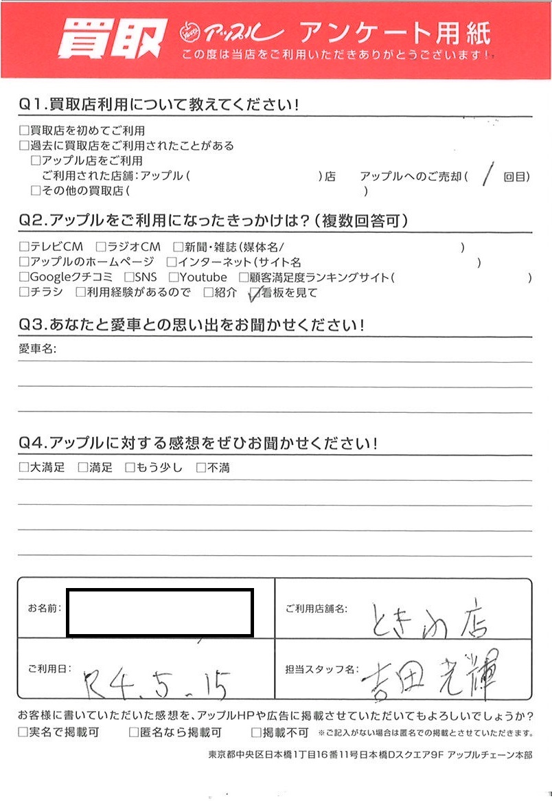 お車のご相談・ 査定だけでもOK! カンタン 入力 30秒 アップルがブランド買取始めました! お電話でも受付中! 受付時間10:00 ~ 18:30 0120-174-177 お車のご相談・ 査定だけでもOK! カンタン 入力 30秒 アップルがブランド買取始めました! お電話でも受付中! 受付時間10:00 ~ 18:30 0120-174-177 アップルがブランド買取始めました! お電話でも受付中! 受付時間10:00 ~ 18:30 0120-174-177 店舗情報 在庫車 スタッフ紹介 ブログ お客様の声 キャンペーン お得 無料査定 click お客様の声 ご記入日: 2022/05/15 S様 車名:ホンダ フィット(H25年9月以降のハイブリッド含む) 前へ 次へ お客様の声一覧を見る