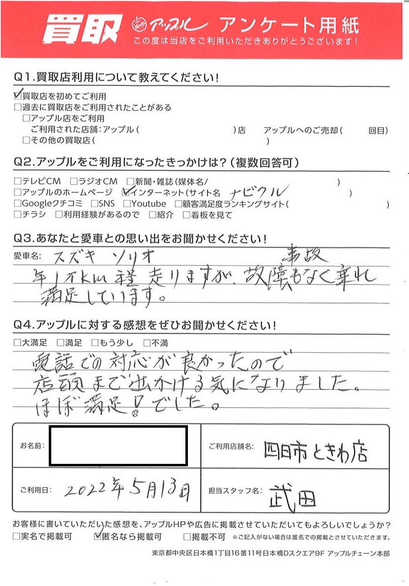 お車のご相談・ 査定だけでもOK! カンタン 入力 30秒 アップルがブランド買取始めました! お電話でも受付中! 受付時間10:00 ~ 18:30 0120-174-177 お車のご相談・ 査定だけでもOK! カンタン 入力 30秒 アップルがブランド買取始めました! お電話でも受付中! 受付時間10:00 ~ 18:30 0120-174-177 アップルがブランド買取始めました! お電話でも受付中! 受付時間10:00 ~ 18:30 0120-174-177 店舗情報 在庫車 スタッフ紹介 ブログ お客様の声 キャンペーン お得 無料査定 click お客様の声 ご記入日: 2022/05/13 K様 車名:スズキ ソリオ 電話での対応が良かったので店頭まで出かける気になりました。ほぼ満足!でした。 前へ 次へ お客様の声一覧を見る