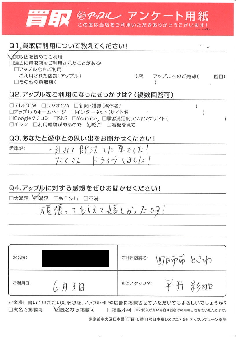 お車のご相談・ 査定だけでもOK! カンタン 入力 30秒 アップルがブランド買取始めました! お電話でも受付中! 受付時間10:00 ~ 18:30 0120-174-177 お車のご相談・ 査定だけでもOK! カンタン 入力 30秒 アップルがブランド買取始めました! お電話でも受付中! 受付時間10:00 ~ 18:30 0120-174-177 アップルがブランド買取始めました! お電話でも受付中! 受付時間10:00 ~ 18:30 0120-174-177 店舗情報 在庫車 スタッフ紹介 ブログ お客様の声 キャンペーン お得 無料査定 click お客様の声 ご記入日: 2022/06/03 S様 車名:ジープ レネゲード 頑張ってもらえて嬉しかったです! 前へ 次へ お客様の声一覧を見る