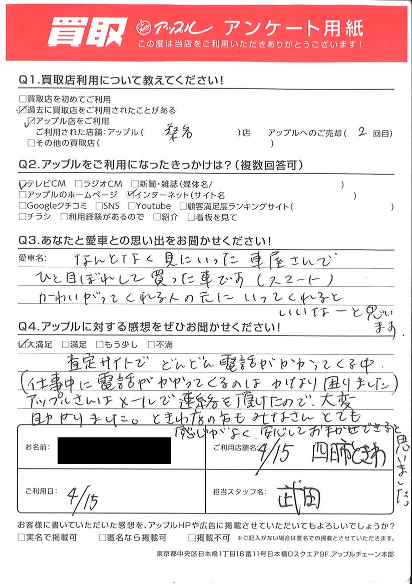 お車のご相談・ 査定だけでもOK! カンタン 入力 30秒 アップルがブランド買取始めました! お電話でも受付中! 受付時間10:00 ~ 18:30 0120-174-177 お車のご相談・ 査定だけでもOK! カンタン 入力 30秒 アップルがブランド買取始めました! お電話でも受付中! 受付時間10:00 ~ 18:30 0120-174-177 アップルがブランド買取始めました! お電話でも受付中! 受付時間10:00 ~ 18:30 0120-174-177 店舗情報 在庫車 スタッフ紹介 ブログ お客様の声 キャンペーン お得 無料査定 click お客様の声 ご記入日: 2022/04/15 G様 車名:スマート フォーツークーペ 査定サイトでどんどん電話がかかってくる中、(仕事中に電話がかかってくるのはかなり困りました。)アップルさんはメールで連絡を頂けたので、大変助かりました。ときわ店の方もみなさんとても感じがよく、安心しておまかせできると思いました。 前へ 次へ お客様の声一覧を見る