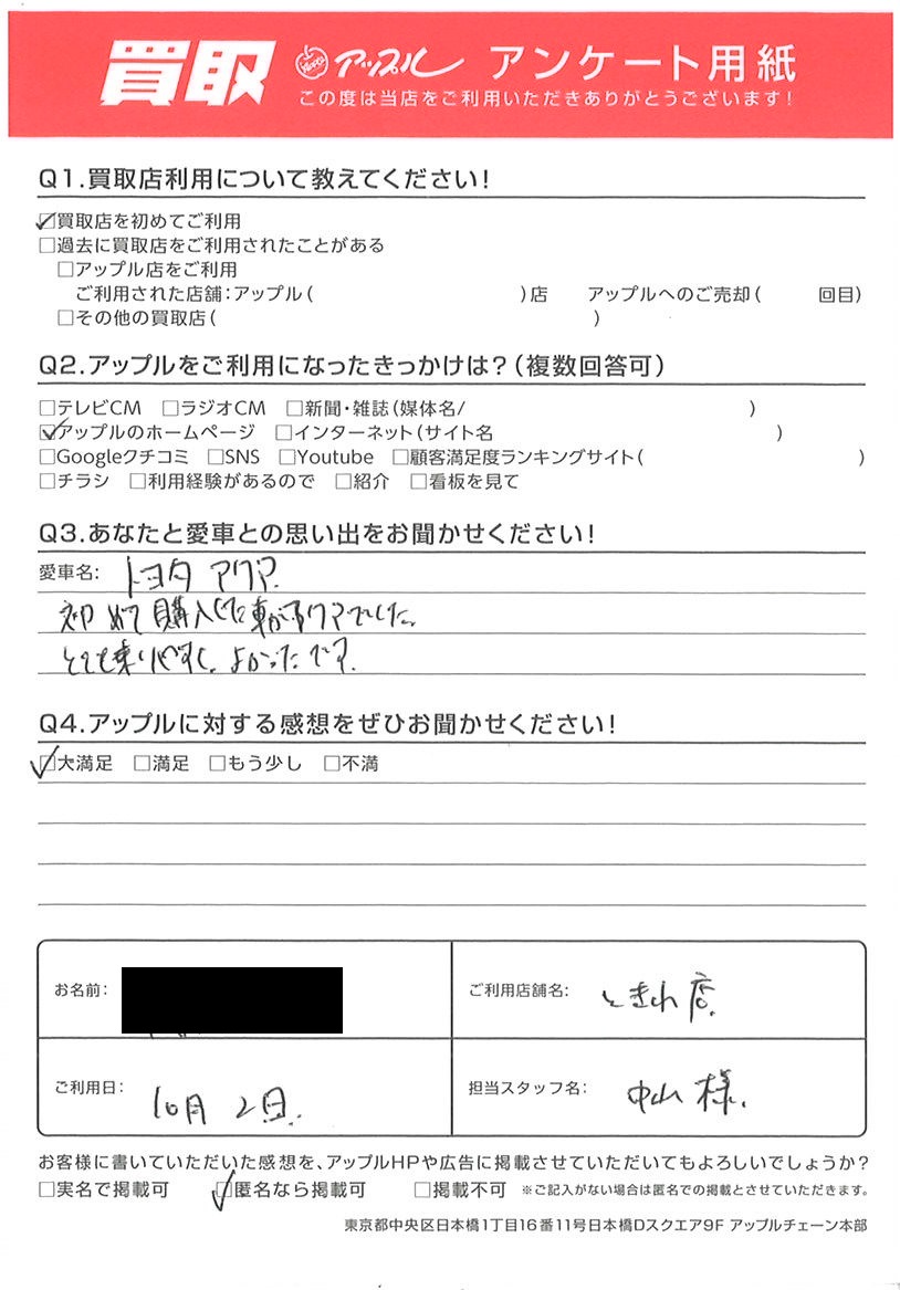 お車のご相談・ 査定だけでもOK! カンタン 入力 30秒 アップルがブランド買取始めました! お電話でも受付中! 受付時間10:00 ~ 18:30 0120-174-177 お車のご相談・ 査定だけでもOK! カンタン 入力 30秒 アップルがブランド買取始めました! お電話でも受付中! 受付時間10:00 ~ 18:30 0120-174-177 アップルがブランド買取始めました! お電話でも受付中! 受付時間10:00 ~ 18:30 0120-174-177 店舗情報 在庫車 スタッフ紹介 ブログ お客様の声 キャンペーン お得 無料査定 click お客様の声 ご記入日: 2022/10/02 K様 車名:トヨタ アクア 初めて購入した車がアクアでした。とても乗りやすく、よかったです。 前へ 次へ お客様の声一覧を見る