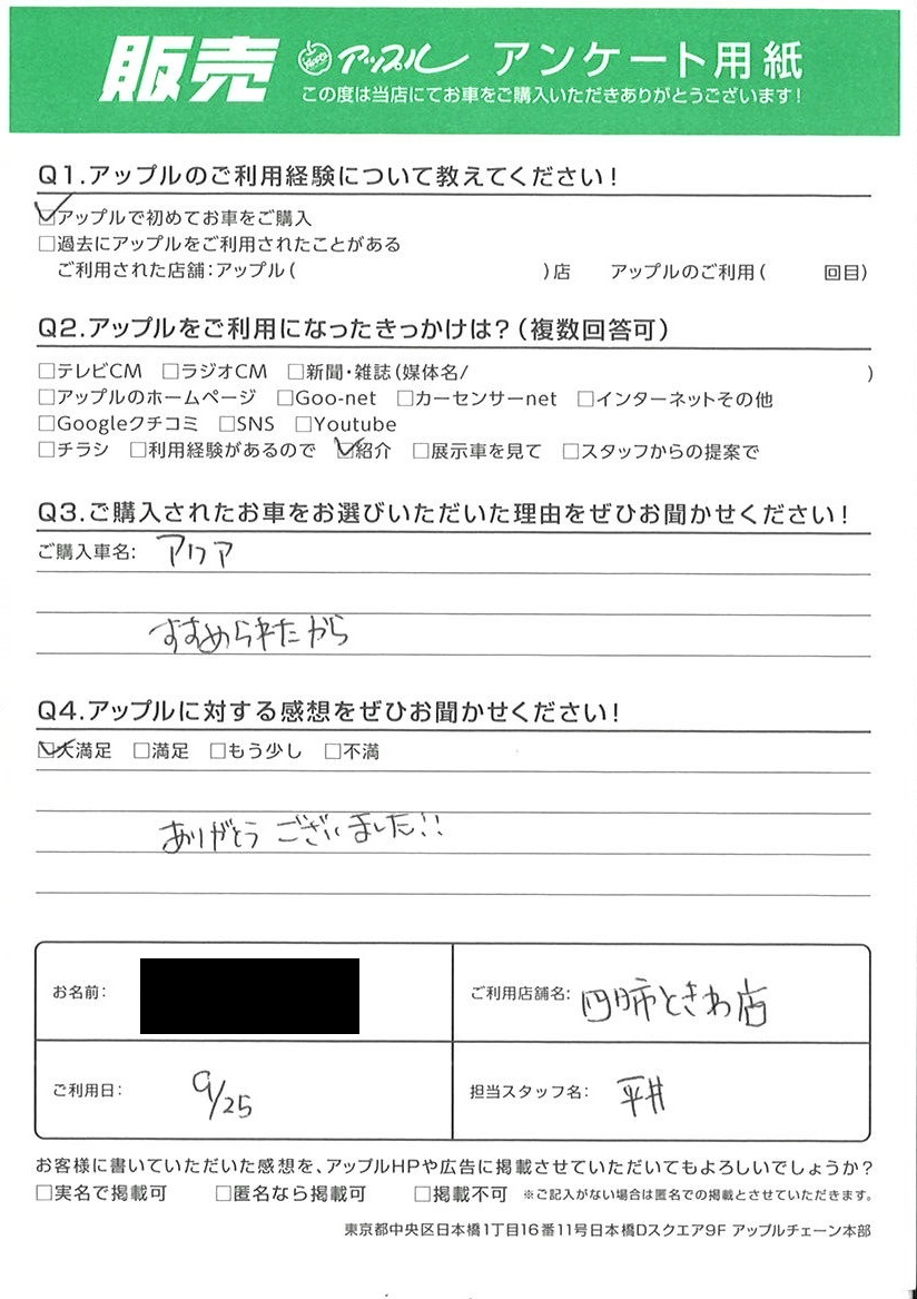 お車のご相談・ 査定だけでもOK! カンタン 入力 30秒 アップルがブランド買取始めました! お電話でも受付中! 受付時間10:00 ~ 18:30 0120-174-177 お車のご相談・ 査定だけでもOK! カンタン 入力 30秒 アップルがブランド買取始めました! お電話でも受付中! 受付時間10:00 ~ 18:30 0120-174-177 アップルがブランド買取始めました! お電話でも受付中! 受付時間10:00 ~ 18:30 0120-174-177 店舗情報 在庫車 スタッフ紹介 ブログ お客様の声 キャンペーン お得 無料査定 click お客様の声 ご記入日: 2022/09/25 K様 車名:トヨタ アクア ありがとうございました!! 前へ 次へ お客様の声一覧を見る