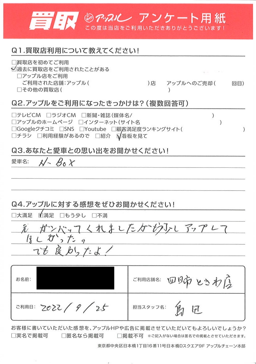 お車のご相談・ 査定だけでもOK! カンタン 入力 30秒 アップルがブランド買取始めました! お電話でも受付中! 受付時間10:00 ~ 18:30 0120-174-177 お車のご相談・ 査定だけでもOK! カンタン 入力 30秒 アップルがブランド買取始めました! お電話でも受付中! 受付時間10:00 ~ 18:30 0120-174-177 アップルがブランド買取始めました! お電話でも受付中! 受付時間10:00 ~ 18:30 0120-174-177 店舗情報 在庫車 スタッフ紹介 ブログ お客様の声 キャンペーン お得 無料査定 click お客様の声 ご記入日: 2022/09/25 K様 車名:ホンダ N-BOX ガンバってくれましたがもう少しアップしてほしかった。でも良かったよ! 前へ 次へ お客様の声一覧を見る