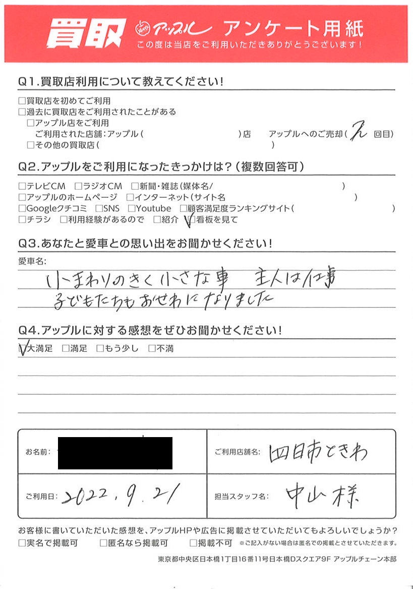 お車のご相談・ 査定だけでもOK! カンタン 入力 30秒 アップルがブランド買取始めました! お電話でも受付中! 受付時間10:00 ~ 18:30 0120-174-177 お車のご相談・ 査定だけでもOK! カンタン 入力 30秒 アップルがブランド買取始めました! お電話でも受付中! 受付時間10:00 ~ 18:30 0120-174-177 アップルがブランド買取始めました! お電話でも受付中! 受付時間10:00 ~ 18:30 0120-174-177 店舗情報 在庫車 スタッフ紹介 ブログ お客様の声 キャンペーン お得 無料査定 click お客様の声 ご記入日: 2022/09/21 M様 車名:ダイハツ タント 小まわりのきく小さな車 主人は仕事子どもたちもおせわになりました 前へ 次へ お客様の声一覧を見る
