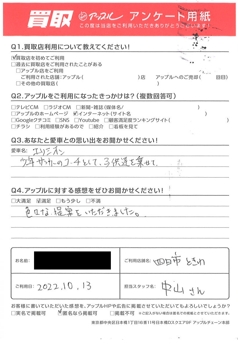 お車のご相談・ 査定だけでもOK! カンタン 入力 30秒 アップルがブランド買取始めました! お電話でも受付中! 受付時間10:00 ~ 18:30 0120-174-177 お車のご相談・ 査定だけでもOK! カンタン 入力 30秒 アップルがブランド買取始めました! お電話でも受付中! 受付時間10:00 ~ 18:30 0120-174-177 アップルがブランド買取始めました! お電話でも受付中! 受付時間10:00 ~ 18:30 0120-174-177 店舗情報 在庫車 スタッフ紹介 ブログ お客様の声 キャンペーン お得 無料査定 click お客様の声 ご記入日: 2022/10/13 S様 車名:ホンダ エリシオン 色々な提案をいただきました。 前へ 次へ お客様の声一覧を見る