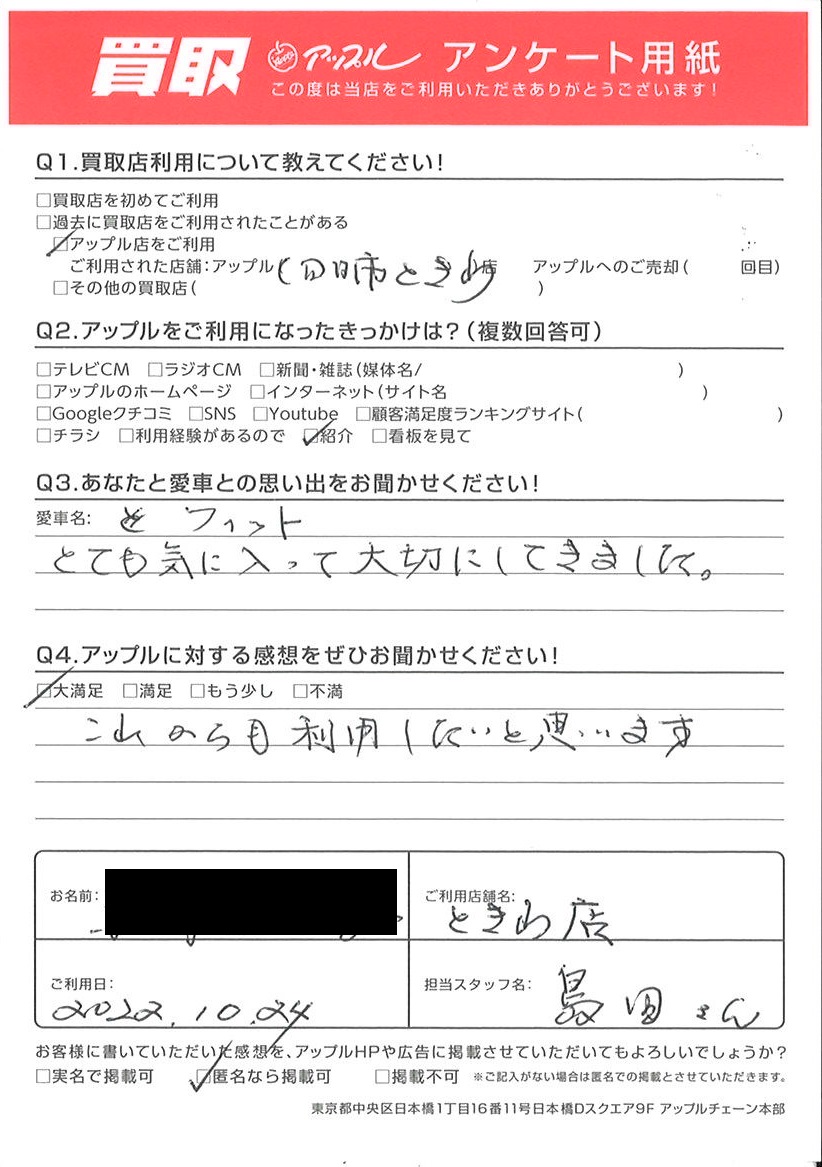 お車のご相談・ 査定だけでもOK! カンタン 入力 30秒 アップルがブランド買取始めました! お電話でも受付中! 受付時間10:00 ~ 18:30 0120-174-177 お車のご相談・ 査定だけでもOK! カンタン 入力 30秒 アップルがブランド買取始めました! お電話でも受付中! 受付時間10:00 ~ 18:30 0120-174-177 アップルがブランド買取始めました! お電話でも受付中! 受付時間10:00 ~ 18:30 0120-174-177 店舗情報 在庫車 スタッフ紹介 ブログ お客様の声 キャンペーン お得 無料査定 click お客様の声 ご記入日: 2022/10/24 A様 車名:ホンダ フィット(H25年9月以降のハイブリッド含む) これからも利用したいと思います 前へ 次へ お客様の声一覧を見る