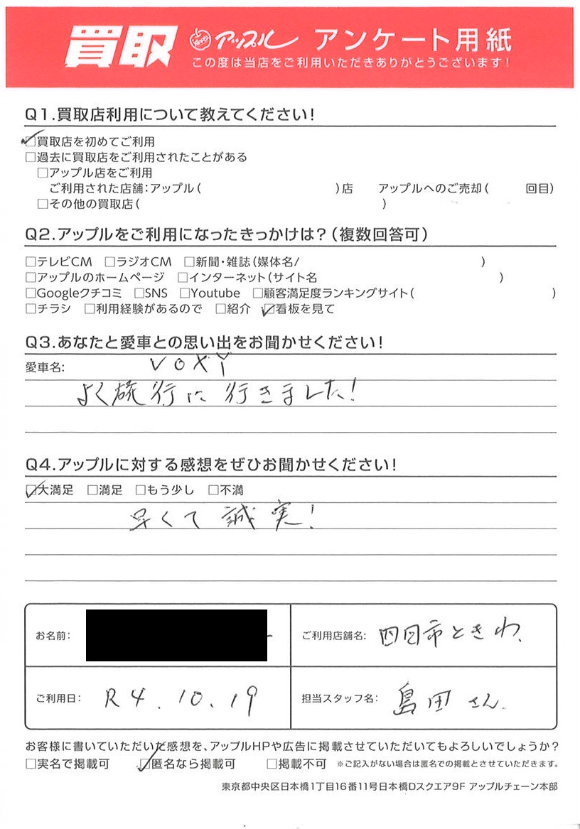 お車のご相談・ 査定だけでもOK! カンタン 入力 30秒 アップルがブランド買取始めました! お電話でも受付中! 受付時間10:00 ~ 18:30 0120-174-177 お車のご相談・ 査定だけでもOK! カンタン 入力 30秒 アップルがブランド買取始めました! お電話でも受付中! 受付時間10:00 ~ 18:30 0120-174-177 アップルがブランド買取始めました! お電話でも受付中! 受付時間10:00 ~ 18:30 0120-174-177 店舗情報 在庫車 スタッフ紹介 ブログ お客様の声 キャンペーン お得 無料査定 click お客様の声 ご記入日: 2022/10/19 Y様 車名:トヨタ ヴォクシー 早くて誠実! 前へ 次へ お客様の声一覧を見る
