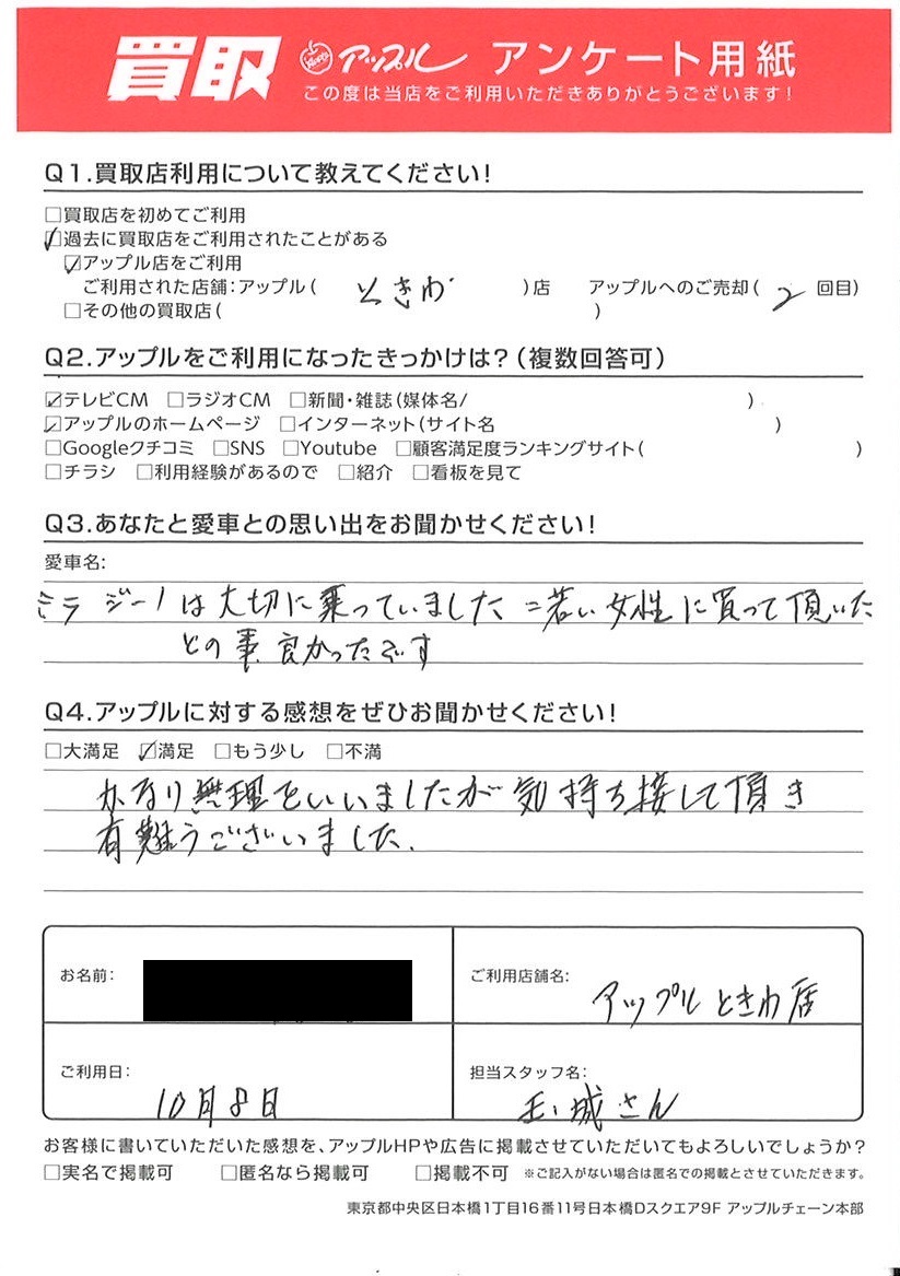 お車のご相談・ 査定だけでもOK! カンタン 入力 30秒 アップルがブランド買取始めました! お電話でも受付中! 受付時間10:00 ~ 18:30 0120-174-177 お車のご相談・ 査定だけでもOK! カンタン 入力 30秒 アップルがブランド買取始めました! お電話でも受付中! 受付時間10:00 ~ 18:30 0120-174-177 アップルがブランド買取始めました! お電話でも受付中! 受付時間10:00 ~ 18:30 0120-174-177 店舗情報 在庫車 スタッフ紹介 ブログ お客様の声 キャンペーン お得 無料査定 click お客様の声 ご記入日: 2022/10/08 K様 車名:スズキ アルト (2015年12月以降のワークス含む) かなり、無理をいいましたが気持ち接して頂き有難うございました。 前へ 次へ お客様の声一覧を見る