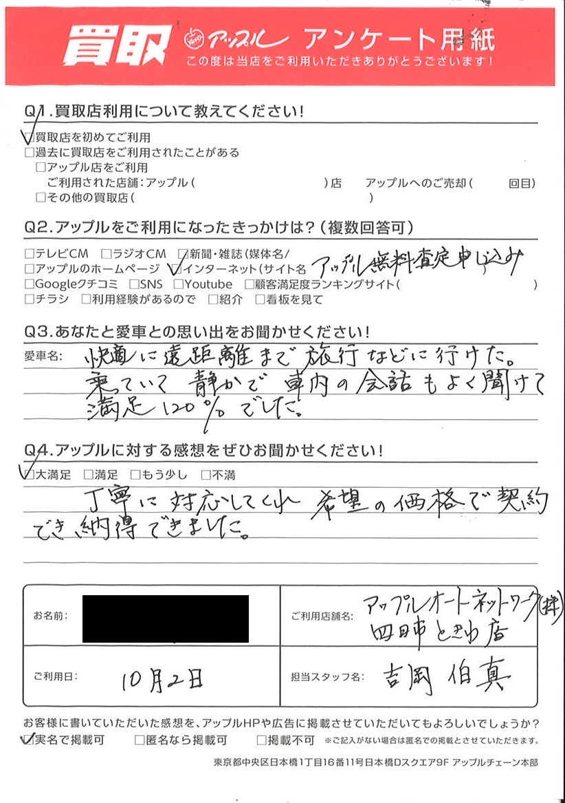 お車のご相談・ 査定だけでもOK! カンタン 入力 30秒 アップルがブランド買取始めました! お電話でも受付中! 受付時間10:00 ~ 18:30 0120-174-177 お車のご相談・ 査定だけでもOK! カンタン 入力 30秒 アップルがブランド買取始めました! お電話でも受付中! 受付時間10:00 ~ 18:30 0120-174-177 アップルがブランド買取始めました! お電話でも受付中! 受付時間10:00 ~ 18:30 0120-174-177 店舗情報 在庫車 スタッフ紹介 ブログ お客様の声 キャンペーン お得 無料査定 click お客様の声 ご記入日: 2022/10/02 W様 車名:レクサス LS (国内仕様 右H H29年10月~HYBRID含) 丁寧に対応してくれ希望の価格で契約でき納得できました。 前へ 次へ お客様の声一覧を見る