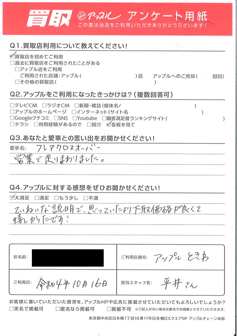 お車のご相談・ 査定だけでもOK! カンタン 入力 30秒 アップルがブランド買取始めました! お電話でも受付中! 受付時間10:00 ~ 18:30 0120-174-177 お車のご相談・ 査定だけでもOK! カンタン 入力 30秒 アップルがブランド買取始めました! お電話でも受付中! 受付時間10:00 ~ 18:30 0120-174-177 アップルがブランド買取始めました! お電話でも受付中! 受付時間10:00 ~ 18:30 0120-174-177 店舗情報 在庫車 スタッフ紹介 ブログ お客様の声 キャンペーン お得 無料査定 click お客様の声 ご記入日: 2022/10/16 K様 車名:マツダ フレアクロスオーバー ていねいな説明で、思っていたより下取価格が良くて嬉しかったです! 前へ 次へ お客様の声一覧を見る