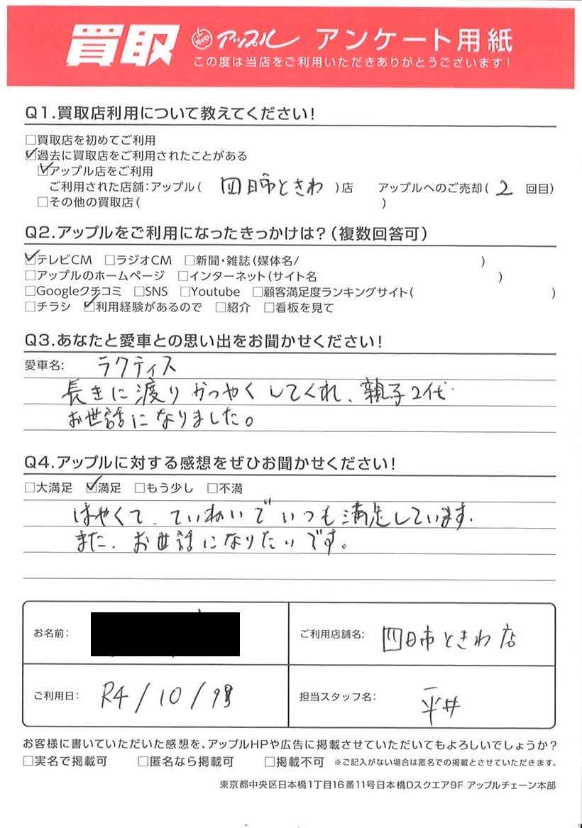 お車のご相談・ 査定だけでもOK! カンタン 入力 30秒 アップルがブランド買取始めました! お電話でも受付中! 受付時間10:00 ~ 18:30 0120-174-177 お車のご相談・ 査定だけでもOK! カンタン 入力 30秒 アップルがブランド買取始めました! お電話でも受付中! 受付時間10:00 ~ 18:30 0120-174-177 アップルがブランド買取始めました! お電話でも受付中! 受付時間10:00 ~ 18:30 0120-174-177 店舗情報 在庫車 スタッフ紹介 ブログ お客様の声 キャンペーン お得 無料査定 click お客様の声 ご記入日: 2022/10/18 A様 車名:トヨタ ラクティス はやくて、ていねいでいつも満足しています。また、お世話になりたいです。 前へ 次へ お客様の声一覧を見る