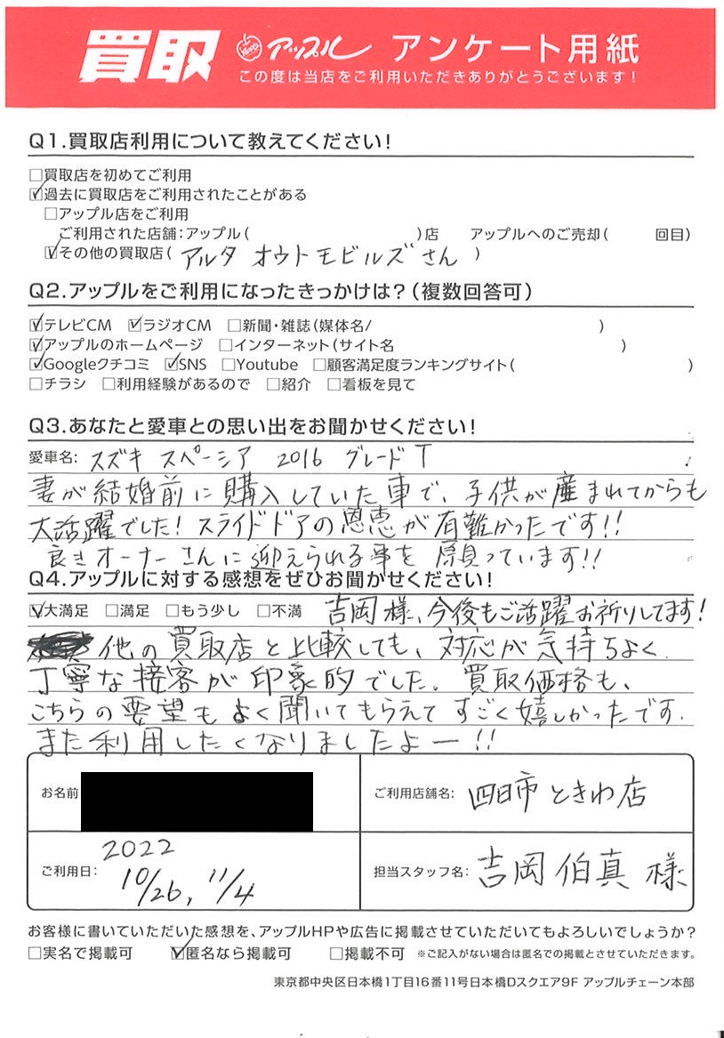 お車のご相談・ 査定だけでもOK! カンタン 入力 30秒 アップルがブランド買取始めました! お電話でも受付中! 受付時間10:00 ~ 18:30 0120-174-177 お車のご相談・ 査定だけでもOK! カンタン 入力 30秒 アップルがブランド買取始めました! お電話でも受付中! 受付時間10:00 ~ 18:30 0120-174-177 アップルがブランド買取始めました! お電話でも受付中! 受付時間10:00 ~ 18:30 0120-174-177 店舗情報 在庫車 スタッフ紹介 ブログ お客様の声 キャンペーン お得 無料査定 click お客様の声 ご記入日: 2022/10/26 I様 車名:スズキ スペーシア 吉岡様、今後もご活躍お祈りしてます!他の買取店と比較しても、対応が気持ちよく丁寧な接客が印象的でした。買取価格も、こちらの要望もよく聞いてもらえてすごく嬉しかったです。また利用したくなりましたよー!! 前へ 次へ お客様の声一覧を見る