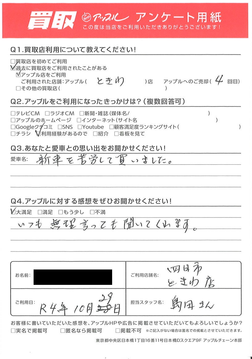 お車のご相談・ 査定だけでもOK! カンタン 入力 30秒 アップルがブランド買取始めました! お電話でも受付中! 受付時間10:00 ~ 18:30 0120-174-177 お車のご相談・ 査定だけでもOK! カンタン 入力 30秒 アップルがブランド買取始めました! お電話でも受付中! 受付時間10:00 ~ 18:30 0120-174-177 アップルがブランド買取始めました! お電話でも受付中! 受付時間10:00 ~ 18:30 0120-174-177 店舗情報 在庫車 スタッフ紹介 ブログ お客様の声 キャンペーン お得 無料査定 click お客様の声 ご記入日: 2022/10/29 M様 車名:トヨタ クラウンロイヤル(H11年9月~H30年6月) いつも無理言っても聞いてくれます。 前へ 次へ お客様の声一覧を見る