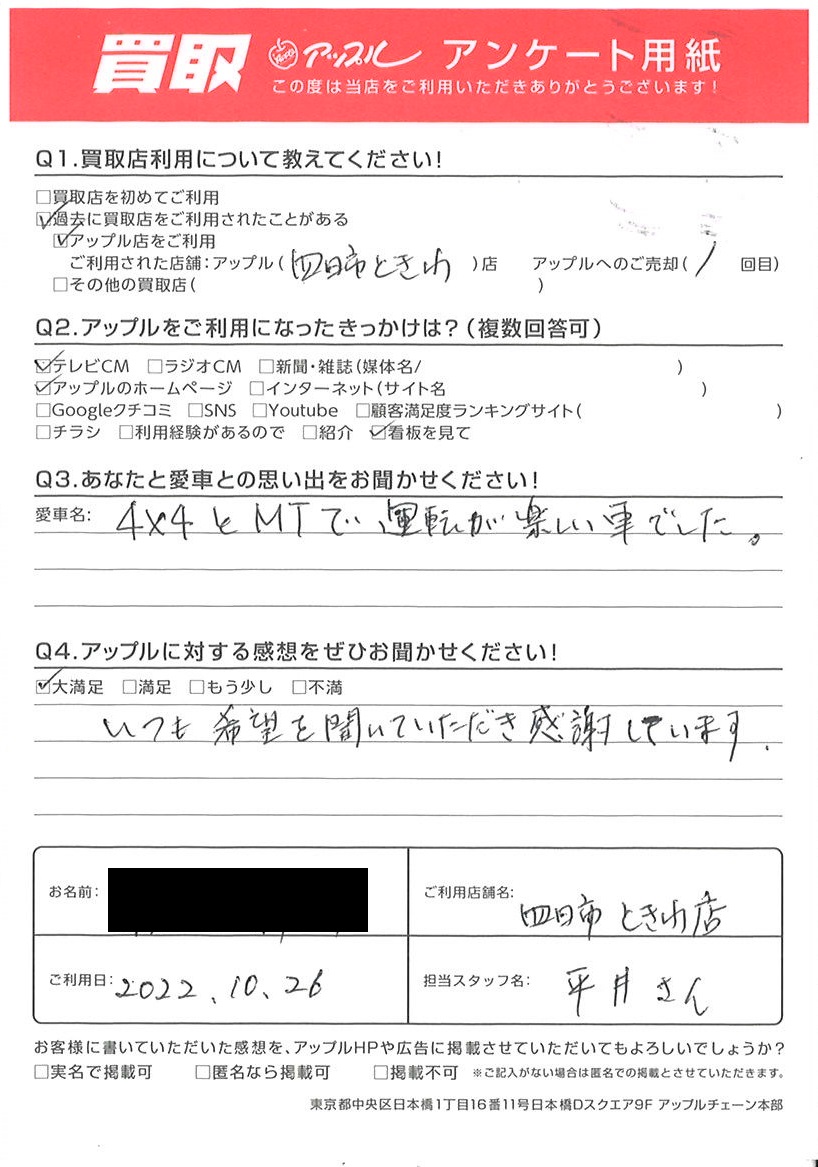 お車のご相談・ 査定だけでもOK! カンタン 入力 30秒 アップルがブランド買取始めました! お電話でも受付中! 受付時間10:00 ~ 18:30 0120-174-177 お車のご相談・ 査定だけでもOK! カンタン 入力 30秒 アップルがブランド買取始めました! お電話でも受付中! 受付時間10:00 ~ 18:30 0120-174-177 アップルがブランド買取始めました! お電話でも受付中! 受付時間10:00 ~ 18:30 0120-174-177 店舗情報 在庫車 スタッフ紹介 ブログ お客様の声 キャンペーン お得 無料査定 click お客様の声 ご記入日: 2022/10/26 K様 車名:フィアット パンダ いつも希望を聞いていただき感謝してます。 前へ 次へ お客様の声一覧を見る