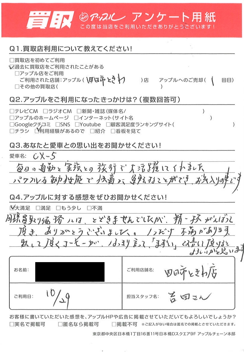 お車のご相談・ 査定だけでもOK! カンタン 入力 30秒 アップルがブランド買取始めました! お電話でも受付中! 受付時間10:00 ~ 18:30 0120-174-177 お車のご相談・ 査定だけでもOK! カンタン 入力 30秒 アップルがブランド買取始めました! お電話でも受付中! 受付時間10:00 ~ 18:30 0120-174-177 アップルがブランド買取始めました! お電話でも受付中! 受付時間10:00 ~ 18:30 0120-174-177 店舗情報 在庫車 スタッフ紹介 ブログ お客様の声 キャンペーン お得 無料査定 click お客様の声 ご記入日: 2022/10/29 F様 車名:マツダ CX-5 目標買取り価格には、とどきませんでしたが、精一杯がんばって頂き、ありがとうございました。1つだけ不満があります。出して頂くコーヒーが、はっきり言って「まずい」改善して頂けるとよろしいかと思います。 前へ 次へ お客様の声一覧を見る