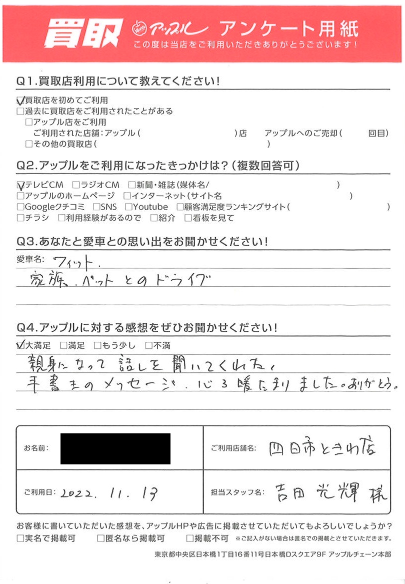 お車のご相談・ 査定だけでもOK! カンタン 入力 30秒 アップルがブランド買取始めました! お電話でも受付中! 受付時間10:00 ~ 18:30 0120-174-177 お車のご相談・ 査定だけでもOK! カンタン 入力 30秒 アップルがブランド買取始めました! お電話でも受付中! 受付時間10:00 ~ 18:30 0120-174-177 アップルがブランド買取始めました! お電話でも受付中! 受付時間10:00 ~ 18:30 0120-174-177 店舗情報 在庫車 スタッフ紹介 ブログ お客様の声 キャンペーン お得 無料査定 click お客様の声 ご記入日: 2022/11/13 H様 車名:ホンダ フィットハイブリッド(~H25年9月) 親身になって話しを聞いてくれた。手書きのメッセージ、心・暖たまりました。ありがとう。 前へ 次へ お客様の声一覧を見る