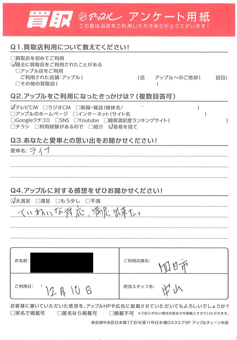 お車のご相談・ 査定だけでもOK! カンタン 入力 30秒 アップルがブランド買取始めました! お電話でも受付中! 受付時間10:00 ~ 18:30 0120-174-177 お車のご相談・ 査定だけでもOK! カンタン 入力 30秒 アップルがブランド買取始めました! お電話でも受付中! 受付時間10:00 ~ 18:30 0120-174-177 アップルがブランド買取始めました! お電話でも受付中! 受付時間10:00 ~ 18:30 0120-174-177 店舗情報 在庫車 スタッフ紹介 ブログ お客様の声 キャンペーン お得 無料査定 click お客様の声 ご記入日: 2022/12/10 N様 車名:ホンダ ライフ ていねいな対応、満足出来た。 前へ 次へ お客様の声一覧を見る