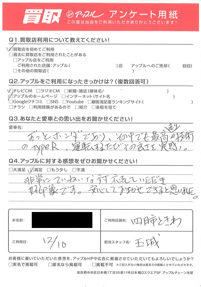 お車のご相談・ 査定だけでもOK! カンタン 入力 30秒 アップルがブランド買取始めました! お電話でも受付中! 受付時間10:00 ~ 18:30 0120-174-177 お車のご相談・ 査定だけでもOK! カンタン 入力 30秒 アップルがブランド買取始めました! お電話でも受付中! 受付時間10:00 ~ 18:30 0120-174-177 アップルがブランド買取始めました! お電話でも受付中! 受付時間10:00 ~ 18:30 0120-174-177 店舗情報 在庫車 スタッフ紹介 ブログ お客様の声 キャンペーン お得 無料査定 click お客様の声 ご記入日: 2022/12/10 M様 車名:ホンダ シビックタイプR 非常にていねいな対応をしていただき好印象です。安心しておまかせできると思いました。 前へ 次へ お客様の声一覧を見る